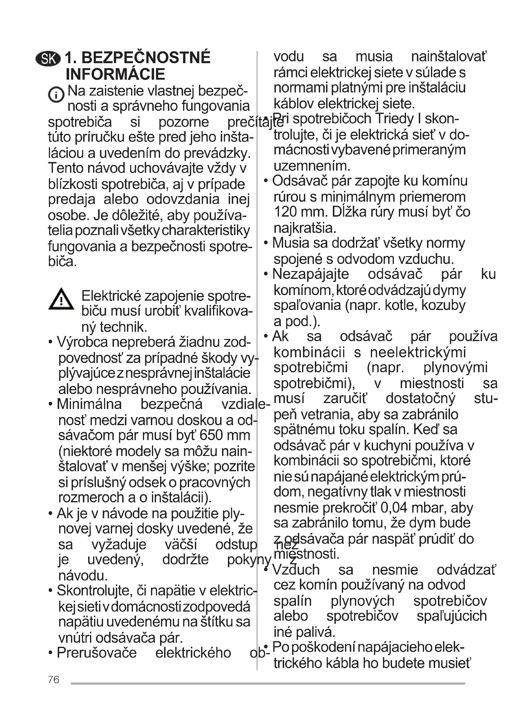 - Nezapájajte odsávač pár ku komínom, ktoré odvádzajú dymy spaľovania(napr.kotle,kozuby a pod.).