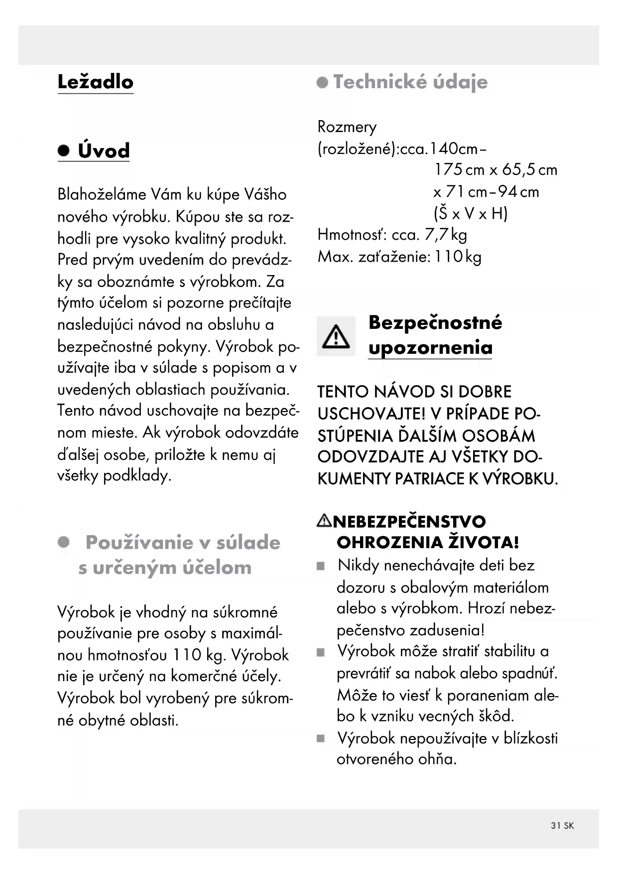 KUMENTY PATRIACE K VÝROBKU. NEBEZPEČENSTVO OHROZENIA ŽIVOTA! Nikdy nenechávajte deti bez dozoru s obalovým materiálom alebo s výrobkom. Hrozí nebez- pečenstvo zadusenia! Výrobok môže stratiť stabilitu a prevrátiť sa nabok alebo spadn úť. Môže to viesť k poraneniam ale- bo k vzniku vecných škôd. Výrobok nepoužívajte v blízkosti otvoreného ohňa.32 SK Pri vybaľovaní alebo rozbaľova- ní výrobku buďte opatrný. Pred použitím skontrolujte správnu stabilitu výrobku. Dbajte na to, aby ste výrobok umiestnili na rovnom a stabilnom podklade. Neprekračujte maximálnu zaťa- žiteľnosť 110 kg. Prekročenie hmotnostnej hranice môže viesť k poraneniam a / alebo k vzniku vecných škôd. Držte ruky vzdialené od sklápa- cieho mechanizmu, aby ste predišli poraneniam. Pred použitím výrobku sa uistite, že je sklápací mechanizmus správne zablokovaný. Dbajte na to, aby bol produkt p red používaním úplne otvorený. Výrobok nie je hračka a smie byť používaný iba pod dozorom dospelej osoby. Výrobok smie vždy používať iba jedna osoba. Pred každým použitím výrobok skontrolujte ohľadom poškodení alebo opotrebovania. Výrobok používajte iba ak je v bezchyb- nom stave. Výrobok nepoužívajte, ak vidíte alebo predpokladáte akékoľvek poškodenia. Pri extrémnych poveternostných podmienkach, napr. pri silnom vetre, zaistite výrobok. Výrobok skladujte v chránených priestoroch. Nestavajte na výrobok. NEBEZPEČENSTVO VECNÝCH ŠKÔD! Neručíme za nehody, ktoré sa vyskytnú v dôsledku nerešpektova- nia vyššie uvedených bezpečnost- ných pokynov alebo nesprávnej manipulácie. Čistenie a údržba Výrobok čistite a fľaky odstraňujte vlhkou handričkou a jemným čis- tiacim prostriedkom, ktorý je ur- čený špeciálne pre tento výrobok. Nečistoty odstráňte z výrobku mäkkou špongiou a čistou vodou. Skôr, ako výrobok znovu zabalí te, nechajte všetky diely dôkladne vyschnúť. Tým zabránite tvorbe plesne, zápachov a zafarbení. Skladovanie V prípade nepoužívania odporúča-