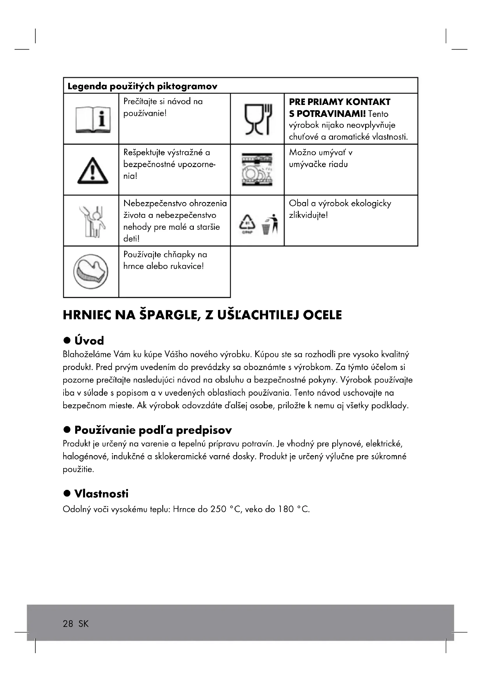 S POTRAVINAMI! Tento výrobok nijako neovplyvňuje chuťové a aromatické vlastnosti. Rešpektujte výstražné a bezpečnostné upozorne- nia! Možno umývať v umývačke riadu Nebezpečenstvo ohrozenia života a nebezpečenstvo nehody pre malé a staršie deti! Obal a výrobok ekologicky zlikvidujte! Používajte chňapky na hrnce alebo rukavice! HRNIEC NA ŠPARGLE, Z UŠĽACHTILEJ OCELE l Úvod Blahoželáme Vám ku kúpe Vášho nového výrobku. Kúpou ste sa rozhodli pre vysoko kvalitný produkt. Pred prvým uvedením do prevádzky sa oboznámte s výrobkom. Za týmto účelom si pozorne prečítajte nasledujúci návod na obsluhu a bezpečnostné pokyny. Výrobok používajte iba v súlade s popisom a v uvedených oblastiach používania. Tento návod uschovajte na bezpečnom mieste. Ak výrobok odovzdáte ďalšej osobe, priložte k nemu aj všetky podklady. l Používanie podľa predpisov Produkt je určený na varenie a tepelnú prípravu potravín. Je vhodný pre plynové, elektrické, halogénové, indukčné a sklokeramické varné dosky. Produkt je určený výlučne pre súkromné použitie. l Vlastnosti Odolný voči vysokému teplu: Hrnce do 250 °C, veko do 180 °C. 28 SKSK 29 Vhodný pre nasledujúce prostredia: Plynový sporák Indukčné platne Elektrický sporák Halogénové varné platne Sklokeramické varné platne