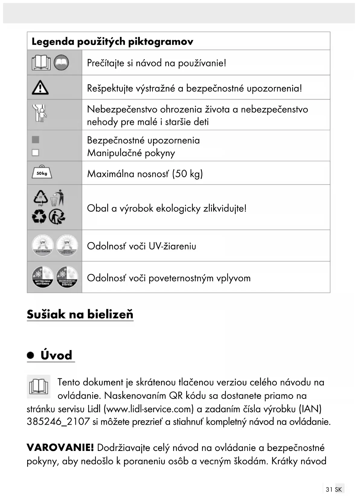PAP Obal a výrobok ekologicky zlikvidujte! Odolnosť voči UV-žiareniu Odolnosť voči poveternostným vplyvom Sušiak na bielizeň Úvod Tento dokument je skrátenou tlačenou verziou celého návodu na ovládanie. Naskenovaním QR kódu sa dostanete priamo na stránku servisu Lidl (www.lidl-service.com) a zadaním čísla výrobku (IAN) 385246_2107 si môžete prezrieť a stiahnuť kompletný návod na ovládanie. VAROVANIE! Dodržiavajte celý návod na ovládanie a bezpečnostné pokyny, aby nedošlo k poraneniu osôb a vecným škodám. Krátky návod32 SK je súčasťou tohto výrobku. Pred používaním výrobku sa oboznámte so všetkými ovládacími a bezpečnostnými pokynmi. Krátky návod si dobre uschovajte a pri predaní výrobku tretím osobám im vydajte i všetky pod- klady. Používanie v súlade s určeným účelom Tento výrobok je sušiak na bielizeň. Iba na používanie v exteriéri. Úprava výrobku nie je povolená a vedie k poškodeniu. Okrem toho to môže mať za následok i ďalšie životunebezpečné riziká a poranenia. Tento výrobok bol koncipovaný výhradne pre súkromné používanie. Nie je určený na komerčné používanie. Výrobca nepreberá ručenie za škody vzniknuté v dôsledku neprimeraného používania. Popis častí