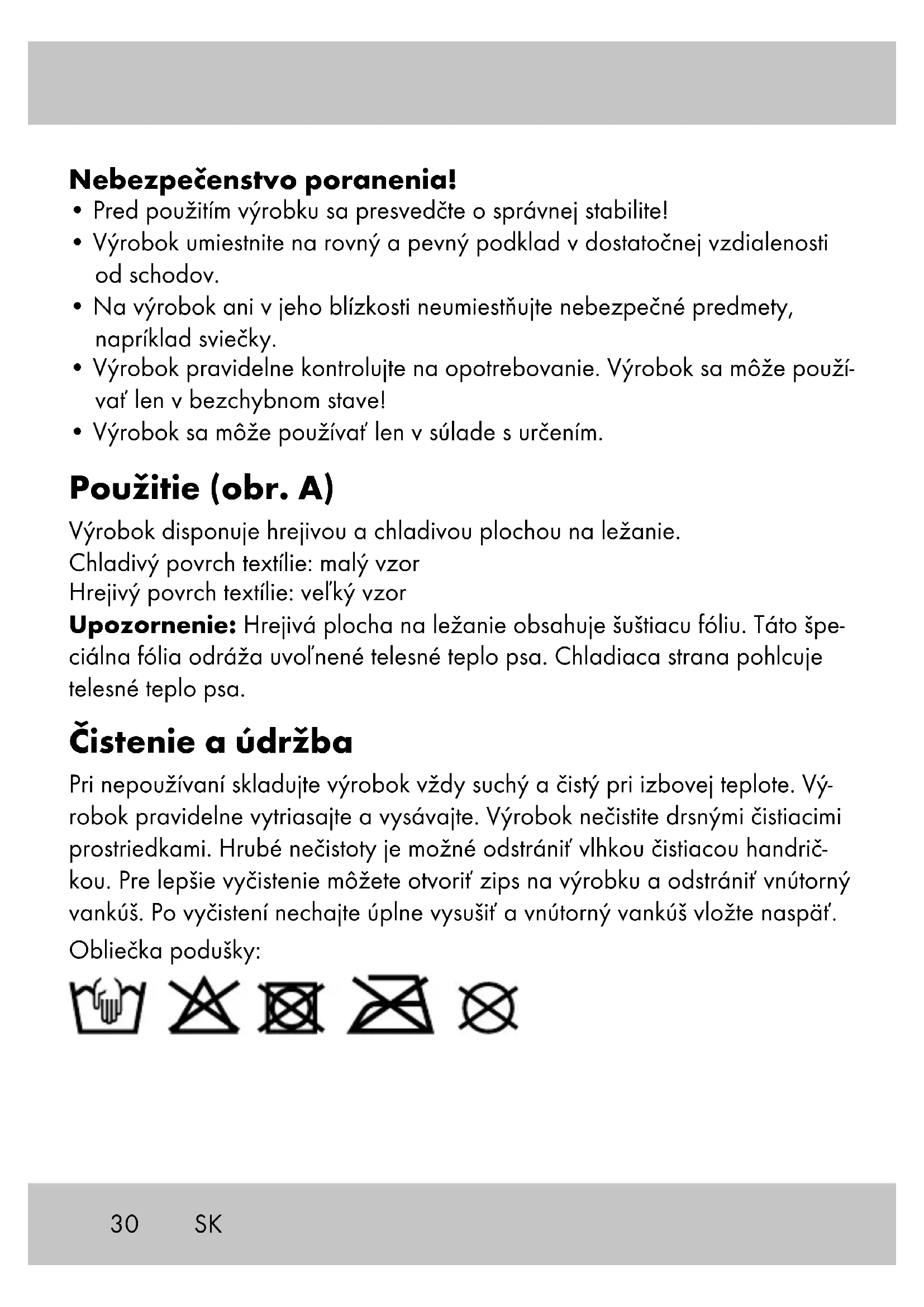 - Výrobok sa môže používať len v súlade s určením. Použitie (obr. A) Výrobok disponuje hrejivou a chladivou plochou na ležanie. Chladivý povrch textílie: malý vzor Hrejivý povrch textílie: veľký vzor Upozornenie: Hrejivá plocha na ležanie obsahuje šuštiacu fóliu. Táto špe- ciálna fólia odráža uvoľnené telesné teplo psa. Chladiaca strana pohlcuje telesné teplo psa. Čistenie a údržba Pri nepoužívaní skladujte výrobok vždy suchý a čistý pri izbovej teplote. Vý- robok pravidelne vytriasajte a vysávajte. Výrobok nečistite drsnými čistiacimi prostriedkami. Hrubé nečistoty je možné odstrániť vlhkou čistiacou handrič- kou. Pre lepšie vyčistenie môžete otvoriť zips na výrobku a odstrániť vnútorný vankúš. Po vyčistení nechajte úplne vysušiť a vnútorný vankúš vložte naspäť. Obliečka podušky: SK31SK Pokyny k likvidácii Výrobok a obalový materiál zlikvidujte v súlade s aktuálnymi miestnymi predpismi. Obalový materiál, ako napr. fóliové vrecúško nepatrí do rúk detí. Obalový materiál uschovajte mimo dosahu detí. Výrobky a obaly likvidujte ekologickým spôsobom. Recyklačný kód slúži na označenia rôznych materiálov na navrátenie do obehu opätovného využitia. Kód sa skladá z recyklačného symbolu - ktorý má odzrkadľovať zhodnotenie recyklačnýého obehu - a číslo označujúce materiál. Pokyny k záruke a priebehu servisu Výrobok bol vyrobený veľmi starostlivo a pod stálou kontrolou. Na tento výrobok poskytuje DELTA-SPORT HANDELSKONTOR GmbH súkromným koncovým užívateľom trojročnú záruku odo dňa kúpy (záručná lehota) po splnení nasledovných podmienok. Záruka platí len na chyby materiálu a spracovania. Záruka sa netýka dielov, ktoré podliehajú bežnému opotre- beniu a preto ich možno považovať za opotrebiteľné diely (napr. batérie), ako aj krehkých dielov, napr. vypínače, akumulátory alebo diely, ktoré sú vyrobené zo skla. Nároky z tejto záruky zanikajú, keď sa výrobok používal neodborne alebo nesprávne, mimo určenia na používanie alebo určeného rozsahu používania alebo neboli dodržané pokyny návodu na obsluhu, s výnimkou, že koncový užívateľ preukáže, že ide o chybu materiálu alebo spracovania, ktorá nebo- la spôsobená niektorou z hore uvedených okolností.32 Záruku je možné uplatniť len počas záručnej lehoty po predložení originálu pokladničného dokladu. Originál pokladničného dokladu preto prosím uschovajte. Záručná doba sa kvôli prípadným záručným opravám, zákonnej záruke alebo ako obchodné gesto nepredlžuje. Platí to aj pre vymenené a opravené diely. Pri reklamáciách sa prosím najskôr obráťte na dole uvedenú Service-Hotline alebo sa s nami spojte prostredníctvom e-mailu. Ak sa jedná o záručný prí- pad, výrobok – podľa našej voľby – bezplatne opravíme, vymeníme alebo vrátime kúpnu cenu. Ďalšie práva zo záruky nevyplývajú. Vaše zákonné práva, hlavne nároky na záručné plnenie voči príslušnému predajcovi, nie sú touto zárukou obmedzené. IAN: 378710_2110 Servis Slovensko Tel.: 0850 232001 E-Mail: deltasport@lidl.sk SK33 ¡Enhorabuena! Con su compra se ha decidido por un artículo de gran calidad. Familiarícese con el artículo antes de usarlo por primera vez. Para ello, lea detenidamente las siguientes instrucciones de uso. Use el artículo solo de la forma descrita y para los campos de aplicación indicados. Conserve estas instrucciones de uso a buen recaudo. Entregue todos los documentos en caso de traspasar el artículo a terceros. Alcance de suministro 1 cama para perros 1 instrucciones de uso 1 guía rápida Datos técnicos Medidas: aprox. 90 x 60 x 15 cm (L x F x A) Fecha de fabricación (mes/año): 04/2022 Uso previsto El artículo no está destinado al uso comercial. El artículo sirve como superfi- cie de descanso para perros en interiores. Indicaciones de seguridad Importante: lea detenidamente estas instrucciones de uso. ¡Es imprescindible conservarlas! ¡Peligro de muerte!