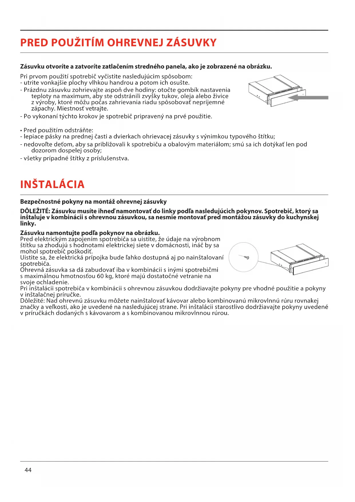 Bezpečnostné pokyny na montáž ohrevnej zásuvky DÔLEŽITÉ: Zásuvku musíte ihneď namontovať do linky podľa nasledujúcich pokynov. Spotrebič, ktorý sa inštaluje vkombinácii sohrevnou zásuvkou, sa nesmie montovať pred montážou zásuvky do kuchynskej linky. Zásuvku namontujte podľa pokynov na obrázku. Pred elektrickým zapojením spotrebiča sa uistite, že údaje na výrobnom štítku sa zhodujú shodnotami elektrickej siete vdomácnosti, ináč by sa mohol spotrebič poškodiť. Uistite sa, že elektrická prípojka bude ľahko dostupná aj po nainštalovaní spotrebiča. Ohrevná zásuvka sa dá zabudovať iba vkombinácii sinými spotrebičmi smaximálnou hmotnosťou 60kg, ktoré majú dostatočné vetranie na svoje ochladenie. Pri inštalácii spotrebiča vkombinácii sohrevnou zásuvkou dodržiavajte pokyny pre vhodné použitie apokyny vinštalačnej príručke. Dôležité: Nad ohrevnú zásuvku môžete nainštalovať kávovar alebo kombinovanú mikrovlnnú rúru rovnakej značky aveľkosti, ako je uvedené na nasledujúcej strane. Pri inštalácii starostlivo dodržiavajte pokyny uvedené vpríručkách dodaných skávovarom askombinovanou mikrovlnnou rúrou.SK