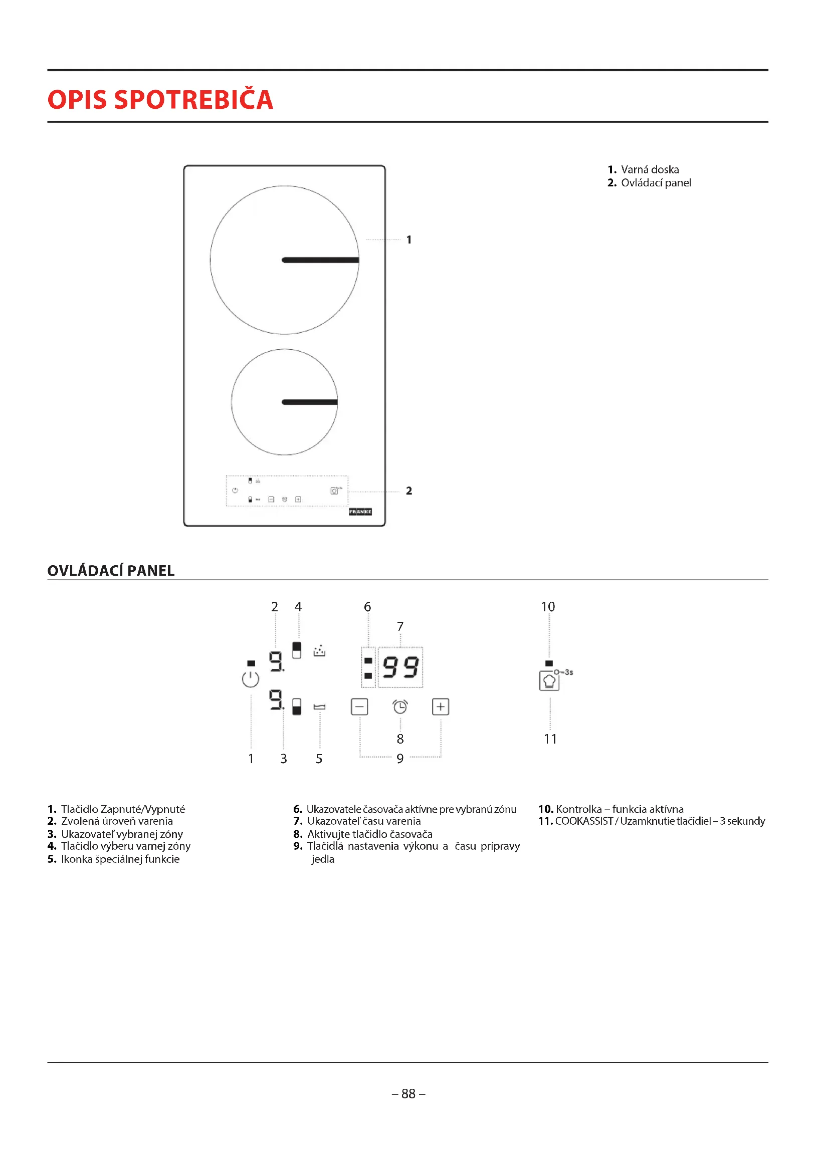 1. Tlačidlo Zapnuté/Vypnuté2. Zvolená úroveň varenia3. Ukazovateľ vybranej zóny4. Tlačidlo výberu varnej zóny5. Ikonka špeciálnej funkcie6. Ukazovatele časovača aktívne pre vybranú zónu7. Ukazovateľ času varenia8. Aktivujte tlačidlo časovača9. Tlačidlá nastavenia výkonu a času prípravy jedla10. Kontrolka – funkcia aktívna11. COOKASSIST / Uzamknutie tlačidiel – 3 sekundy