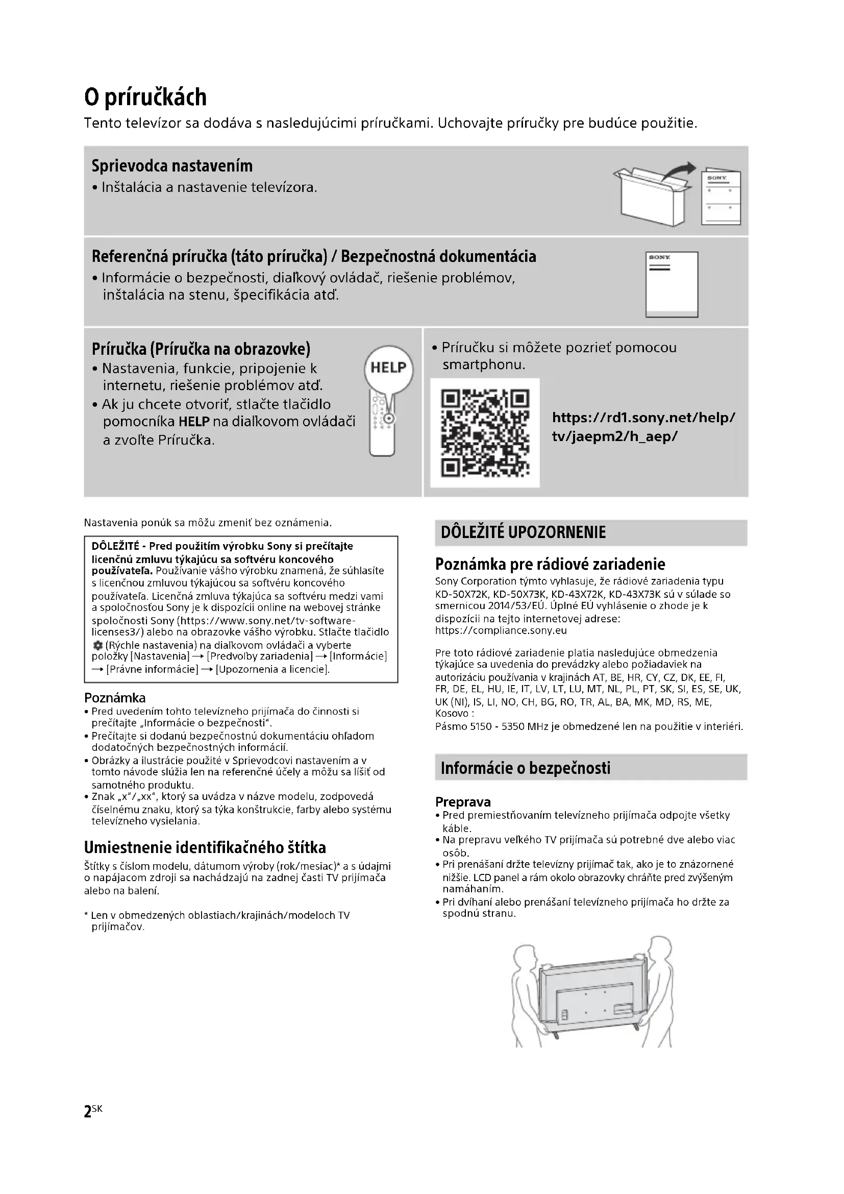 - Príručku si môžete pozrieť pomocou smartphonu. https://rd1.sony.net/help/ tv/jaepm2/h_aep/ DÔLEŽITÉ - Pred použitím výrobku Sony si prečítajte licenčnú zmluvu týkajúcu sa softvéru koncového používateľa. Používanie vášho výrobku znamená, že súhlasíte s licenčnou zmluvou týkajúcou sa softvéru koncového používateľa. Licenčná zmluva týkajúca sa softvéru medzi vami a spoločnosťou Sony je k dispozícii online na webovej stránke spoločnosti Sony (https://www.sony.net/tv-software- licenses3/) alebo na obrazovke vášho výrobku. Stlačte tlačidlo (Rýchle nastavenia) na diaľkovom ovládači a vyberte položky [Nastavenia] [Predvoľby zariadenia] [Informácie] [Právne informácie] [Upozornenia a licencie].