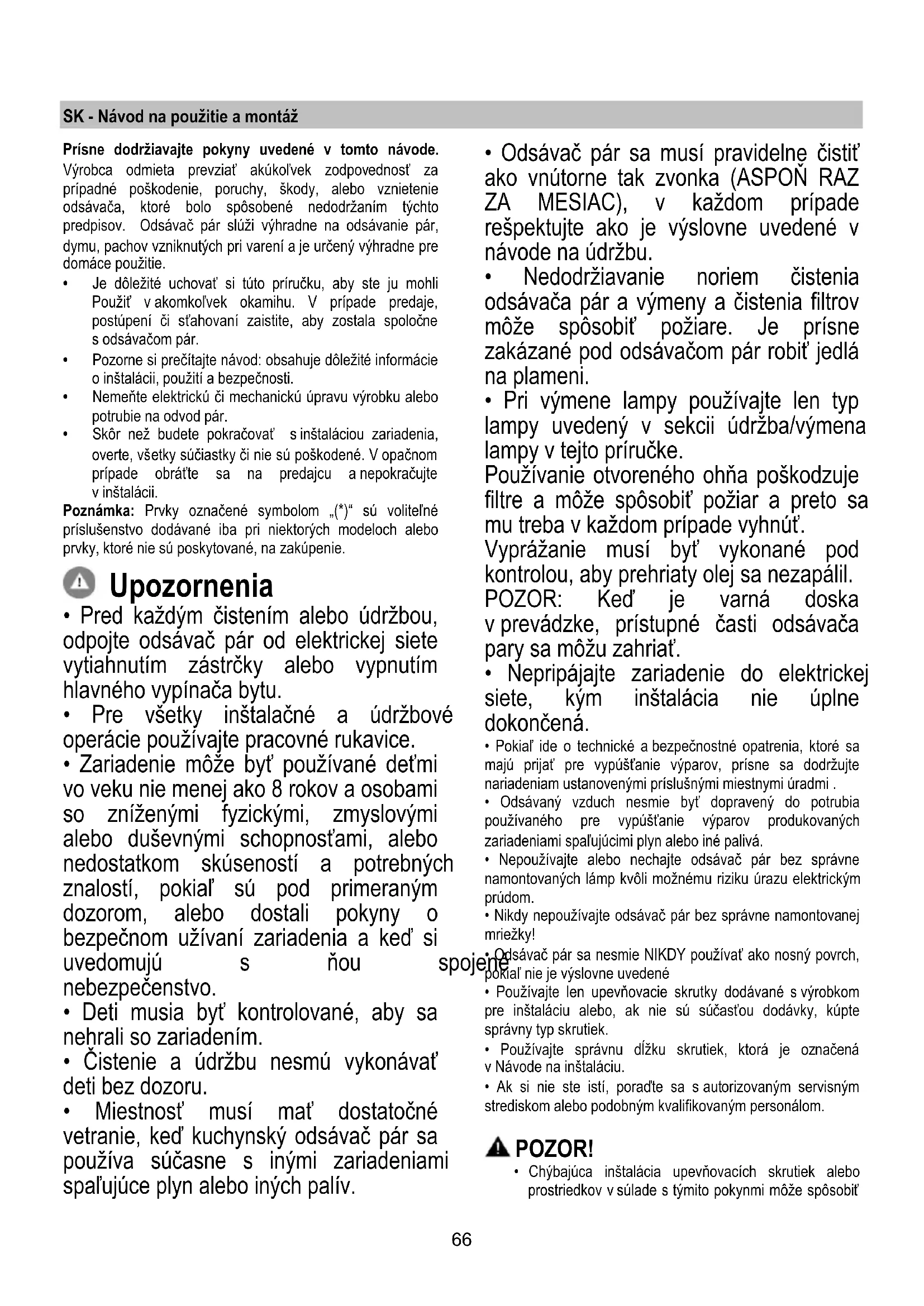- Pri výmene lampy používajte len typ lampy uvedený v sekcii údržba/výmena lampy v tejto príručke. Používanie otvoreného ohňa poškodzuje filtre a môže spôsobiť požiar a preto sa mu treba v každom prípade vyhnúť. Vyprážanie musí byť vykonané pod kontrolou, aby prehriaty olej sa nezapálil. POZOR: Keď je varná doska v prevádzke, prístupné časti odsávača pary sa môžu zahriať.