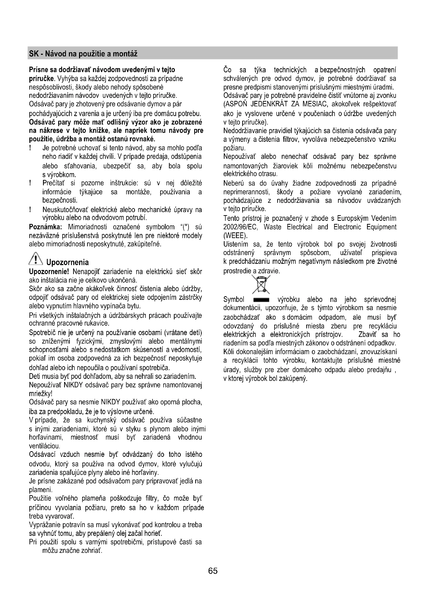 Jestliže osvětlení nefunguje, dříve než zavoláte servis si ověřte, zda jste správně nasadili žárovky do uložení.65 SK - Návod na použitie a montáž Prísne sa dodržiavať návodom uvedenými v tejto príručke. Vyhýba sa každej zodpovednosti za prípadne nespôsoblivosti, škody alebo nehody spôsobenè nedodržiavaním návodov uvedených v tejto príručke. Odsávač pary je zhotovený pre odsávanie dymov a pár pochádyajúcich z varenia a je určený iba pre domácu potrebu. Odsávač pary môže mať odlišný výzor ako je zobrazené na nákrese v tejto knižke, ale napriek tomu návody pre použitie, údržba a montáž ostanú rovnaké. ! Je potrebné uchovať si tento návod, aby sa mohlo podľa neho riadiť v každej chvíli. V prípade predaja, odstúpenia alebo sťahovania, ubezpečiť sa, aby bola spolu s výrobkom. ! Prečítať si pozorne inštrukcie: sú v nej dôležité informácie týkajúce sa montáže, používania a bezpečnosti. ! Neuskutočňovať elektrické alebo mechanické úpravy na výrobku alebo na odvodovom potrubí. Poznámka: Mimoriadnosti označené symbolom “(*) sú nezáväzné príslušenstvá poskytnuté len pre niektoré modely alebo mimoriadnosti neposkytnuté, zakúpiteľné. Upozornenia Upozornenie! Nenapojiť zariadenie na elektrickú sieť skôr ako inštalácia nie je celkovo ukončená. Skôr ako sa začne akákoľvek činnosť čistenia alebo údržby, odpojiť odsávač pary od elektrickej siete odpojením zástrčky alebo vypnutím hlavného vypínača bytu. Pri všetkých inštalačných a údržbárskych prácach používajte ochranné pracovné rukavice. Spotrebič nie je určený na používanie osobami (vrátane detí) so zníženými fyzickými, zmyslovými alebo mentálnymi schopnosťami alebo s nedostatkom skúseností a vedomostí, pokiaľ im osoba zodpovedná za ich bezpečnosť neposkytuje dohľad alebo ich nepoučila o používaní spotrebiča. Deti musia byť pod dohľadom, aby sa nehrali so zariadením. Nepoužívať NIKDY odsávač pary bez správne namontovanej mriežky! Odsávač pary sa nesmie NIKDY používať ako oporná plocha, iba za predpokladu, že je to výslovne určené. V prípade, že sa kuchynský odsávač používa súčastne s inými zariadeniami, ktoré sú v styku s plynom alebo inými horľavinami, miestnosť musí byť zariadená vhodnou ventiláciou. Odsávací vzduch nesmie byť odvádzaný do toho istého odvodu, ktorý sa používa na odvod dymov, ktoré vylučujú zariadenia spaľujúce plyny alebo iné horľaviny. Je prísne zakázané pod odsávačom pary pripravovať jedlá na plameni. Použitie voľného plameňa poškodzuje filtry, čo može byť príčinou vyvolania požiaru, preto sa ho v každom prípade treba vyvarovať. Vyprážanie potravín sa musí vykonávať pod kontrolou a treba sa vyhnúť tomu, aby prepálený olej začal horieť. Pri použití spolu s varnými spotrebičmi, prístupové časti sa môžu značne zohriať. Čo sa týka technických a bezpečnostných opatrení schválených pre odvod dymov, je potrebné dodržiavať sa presne predpismi stanovenými príslušnými miestnými úradmi. Odsávač pary je potrebné pravidelne čistiť vnútorne aj zvonku (ASPOŇ JEDENKRÁT ZA MESIAC, akokoľvek rešpektovať ako je vyslovene určené v poučeniach o údržbe uvedených v tejto príručke). Nedodržiavanie pravidiel týkajúcich sa čistenia odsávača pary a výmeny a čistenia filtrov, vyvoláva nebezpečenstvo vzniku požiaru. Nepoužívať alebo nenechať odsávač pary bez správne namontovaných žiaroviek kôli možnému nebezpečenstvu elektrického otrasu. Neberú sa do úvahy žiadne zodpovednosti za prípadné neprimerannosti, škody a požiare vyvolané zariadením, pochádzajúce z nedodržiavania sa návodov uvádzaných v tejto príručke. Tento prístroj je poznačený v zhode s Europským Vedením 2002/96/EC, Waste Electrical and Electronic Equipment (WEEE). Uistením sa, že tento výrobok bol po svojej životnosti odstránený správnym spôsobom, užívateľ prispieva k predchádzaniu možným negatívnym následkom pre životné prostredie a zdravie. Symbol výrobku alebo na jeho sprievodnej dokumentácii, upozorňuje, že s týmto výrobkom sa nesmie zaobchádzať ako s domácim odpadom, ale musí byť odovzdaný do príslušné miesta zberu pre recykláciu elektrických a elektronických prístrojov. Zbaviť sa ho riadením sa podľa miestných zákonov o odstránení odpadkov. Kôli dokonalejším informáciam o zaobchádzaní, znovuzískaní a recyklácii tohto výrobku, kontaktujte príslušné miestné úrady, služby pre zber domáceho odpadu alebo predajňu , v ktorej výrobok bol zakúpený.66 Používanie Odsávač pary je realizovaný na požitie vo verzii odsávania a vonkajšej evakulácie alebo filtrácie s vnútornou recykláciou. Odsávacia verzia Výpary sú vypúšťané von prostredníctvom výfukového potrubia upevneného na spojovacej prírube. Priemer výfukového potrubia sa musí zhodovaž s priemerom spojovacieho prstenca. Upozornenie! Evakuačné potrubie nie je dodané, musí byť zakúpené. Na vodorovnej (horizontálnej) časti, potrubie musí mať mierny náklon smerom nahor (približne 10°), aby sa vzduch mohol ľahšie odvádzal smerom von. Ak odsávač pary je vybavený uhlíkovými filtrami, tak tie musia byť odstránené. Napojiť odsávač pary o odvodové trubice a otvory pre múry s rovnakým priemerom ako vývod vzduchu (spojovacia príruba). Použitie odvodových trubíc a otvorov do steny s menším priemerom má za následok zníženie odsávadsej výkonnosti e drastické zvýšenie hlučnosti. V tejto zásluhe sa vyhýba každej zodpovednosti. ! Použiť potrubie dlhé, ktoré je minimálne nevyhnutné. ! Používať potrubie s najmenším možným počtom ohnutím (maximálny uhol ohnutia: 90°). ! Vyhnúť sa drastickým zmenám sekcií potrubia. ! Používať potrubie s čím 