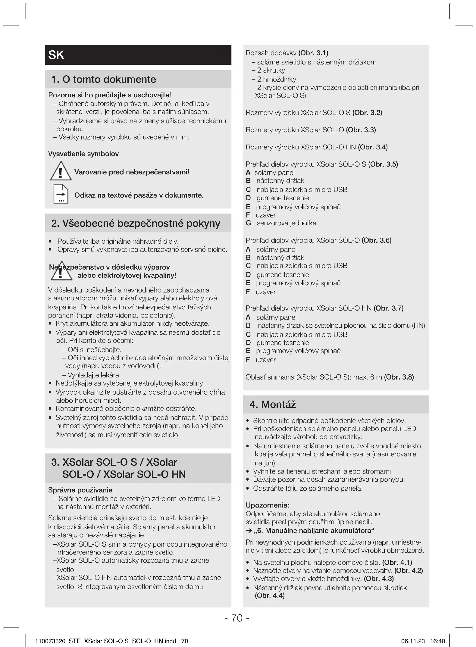 SOL-O/XSolarSOL-OHN Správne používanie – Solárne svietidlo so svetelným zdrojom vo forme LED na nástennú montáž vexteriéri. Solárne svietidlá prinášajú svetlo do miest, kde nie je kdispozícii sieťové napätie. Solárny panel a akumulátor sa starajú onezávislé napájanie. – XSolarSOL-OS sníma pohyby pomocou integrovaného infračerveného senzora a zapne svetlo. – XSolarSOL-O automaticky rozpozná tmu a zapne svetlo. – XSolarSOL-OHN automaticky rozpozná tmu a zapne svetlo. Sintegrovaným osvetleným číslom domu.