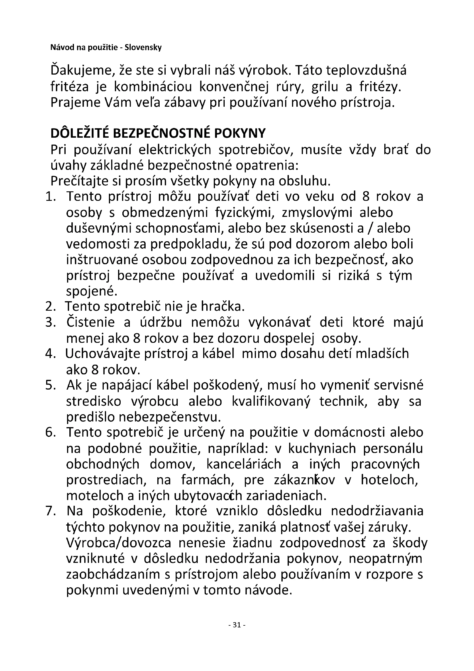 týchto pokynov na použitie, zaniká platnosť vašej záruky. Výrobca/dovozca nenesie žiadnu zodpovednosť za škody vzniknuté v dôsledku nedodržania pokynov, neopatrným zaobchádzaním s prístrojom alebo používaním v rozpore s pokynmi uvedenými v tomto návode.- 32 -