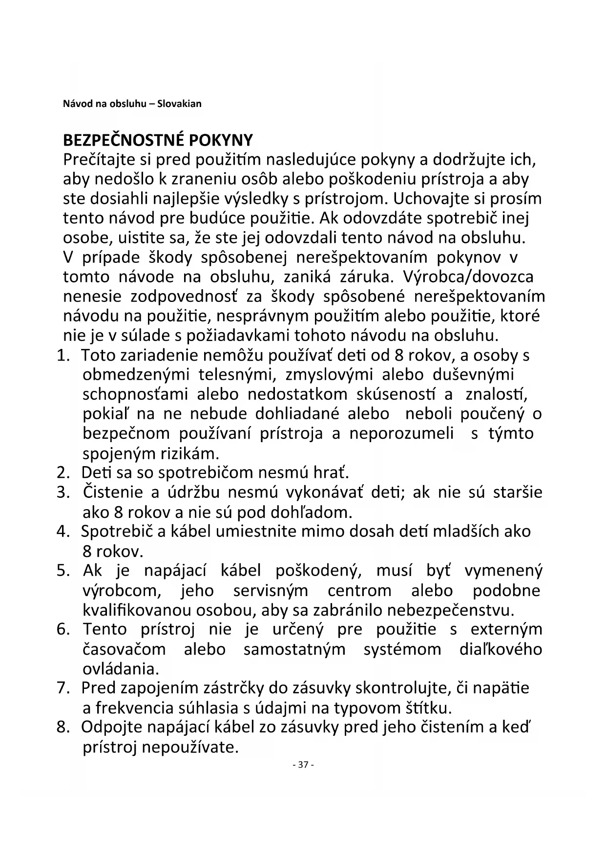 Prečítajte si pred použitím nasledujúce pokyny a dodržujte ich, aby nedošlo k zraneniu osôb alebo poškodeniu prístroja a aby ste dosiahli najlepšie výsledky s prístrojom. Uchovajte si prosím tento návod pre budúce použitie. Ak odovzdáte spotrebič inej osobe, uistite sa, že ste jej odovzdali tento návod na obsluhu. V prípade škody spôsobenej nerešpektovaním pokynov v tomto návode na obsluhu, zaniká záruka. Výrobca/dovozca nenesie zodpovednosť za škody spôsobené nerešpektovaním návodu na použitie, nesprávnym použitím alebo použitie, ktoré nie je v súlade s požiadavkami tohoto návodu na obsluhu.