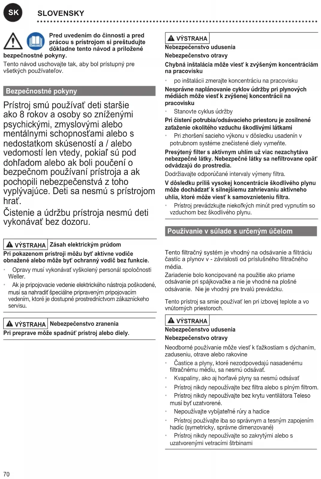- Prístrojprevádzkujteniekoľkýchminútpredvypnutímso vzduchombezškodlivéhoplynu. Používanie v súlade s určeným účelom použitia Tento ltračný systém je vhodný na odsávanie a ltráciu častíc a plynov v - závislosti od príslušného ltračného média. Zariadenie bolo koncipované na použitie ako priame odsávanie pri spájkovačke a nie je vhodné na plošné odsávanie. Nie je vhodný pre trvalú prevádzku. Tento prístroj sa smie používať len pri izbovej teplote a vo vnútorných priestoroch. VÝSTRAHA Nebezpečenstvo udusenia Nebezpečenstvo otravy Neodborné používanie môže viesť k ťažkostiam s dýchaním, zaduseniu, otrave alebo rakovine