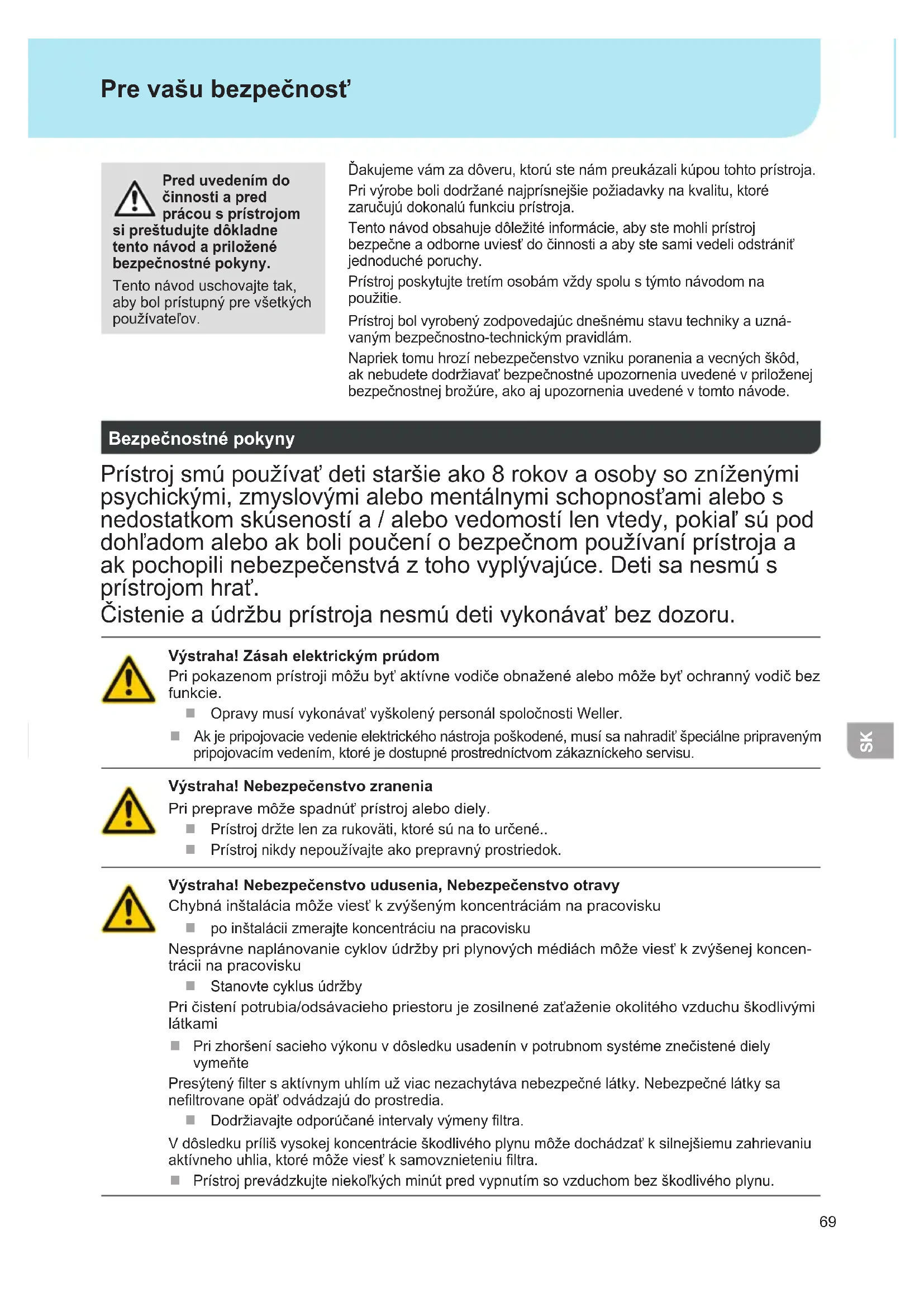 Ďakujemevámzadôveru,ktorústenámpreukázalikúpoutohtoprístroja. Privýrobebolidodržanénajprísnejšiepožiadavkynakvalitu,ktoré zaručujúdokonalúfunkciuprístroja. Tentonávodobsahujedôležitéinformácie,abystemohliprístroj bezpečneaodborneuviesťdočinnostiaabystesamivedeliodstrániť jednoduchéporuchy. Prístrojposkytujtetretímosobámvždyspolustýmtonávodomna použitie. Prístrojbolvyrobenýzodpovedajúcdnešnémustavutechnikyauzná- vanýmbezpečnostno-technickýmpravidlám. Napriektomuhrozínebezpečenstvovznikuporaneniaavecnýchškôd, aknebudetedodržiavaťbezpečnostnéupozorneniauvedenévpriloženej bezpečnostnejbrožúre,akoajupozorneniauvedenévtomtonávode. Pre vašu bezpečnosť Pred uvedením do činnosti a pred prácou s prístrojom si preštudujte dôkladne tento návod a priložené bezpečnostné pokyny. Tentonávoduschovajtetak, abybolprístupnýprevšetkých používateľov. Bezpečnostné pokyny Prístrojsmúpoužívaťdetistaršieako8rokovaosobysozníženými psychickými,zmyslovýmialebomentálnymischopnosťamialebos nedostatkomskúsenostía/alebovedomostílenvtedy,pokiaľsúpod dohľadomaleboakbolipoučeníobezpečnompoužívaníprístrojaa akpochopilinebezpečenstváztohovyplývajúce.Detisanesmús prístrojomhrať. Čistenieaúdržbuprístrojanesmúdetivykonávaťbezdozoru. Výstraha! Zásah elektrickým prúdom Pripokazenomprístrojimôžubyťaktívnevodičeobnaženéalebomôžebyťochrannývodičbez funkcie. OpravymusívykonávaťvyškolenýpersonálspoločnostiWeller. Akjepripojovacievedenieelektrickéhonástrojapoškodené,musísanahradiťšpeciálnepripraveným pripojovacímvedením,ktoréjedostupnéprostredníctvomzákazníckehoservisu. Výstraha! Nebezpečenstvo zranenia Priprepravemôžespadnúťprístrojalebodiely. Prístrojdržtelenzarukoväti,ktorésúnatourčené.. Prístrojnikdynepoužívajteakoprepravnýprostriedok. Výstraha! Nebezpečenstvo udusenia, Nebezpečenstvo otravy Chybnáinštaláciamôževiesťkzvýšenýmkoncentráciámnapracovisku poinštaláciizmerajtekoncentráciunapracovisku Nesprávnenaplánovaniecyklovúdržbypriplynovýchmédiáchmôževiesťkzvýšenejkoncen- tráciinapracovisku Stanovtecyklusúdržby Pričistenípotrubia/odsávaciehopriestorujezosilnenézaťaženieokolitéhovzduchuškodlivými látkami Prizhoršenísaciehovýkonuvdôsledkuusadenínvpotrubnomsystémeznečistenédiely vymeňte Presýtenýltersaktívnymuhlímužviacnezachytávanebezpečnélátky. Nebezpečnélátkysa neltrovaneopäťodvádzajúdoprostredia. Dodržiavajteodporúčanéintervalyvýmenyltra. Vdôsledkuprílišvysokejkoncentrácieškodlivéhoplynumôžedochádzaťksilnejšiemuzahrievaniu aktívnehouhlia,ktorémôževiesťksamovznieteniultra. Prístrojprevádzkujteniekoľkýchminútpredvypnutímsovzduchombezškodlivéhoplynu.70