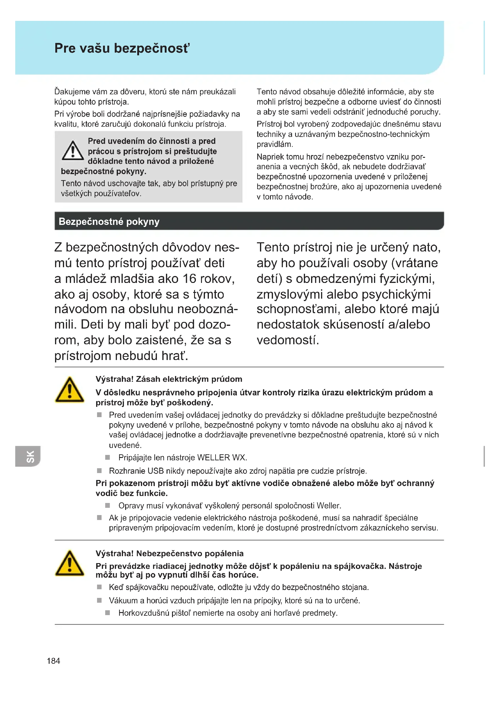 Ďakujeme vám za dôveru, ktorú ste nám preukázali kúpou tohto prístroja. Pri výrobe boli dodržané najprísnejšie požiadavky na kvalitu, ktoré zaručujú dokonalú funkciu prístroja. Pred uvedením do činnosti a pred prácou s prístrojom si preštudujte dôkladne tento návod a priložené bezpečnostné pokyny. Tento návod uschovajte tak, aby bol prístupný pre všetkých používateľov. Tento návod obsahuje dôležité informácie, aby ste mohli prístroj bezpečne a odborne uviesť do činnosti a aby ste sami vedeli odstrániť jednoduché poruchy. Prístroj bol vyrobený zodpovedajúc dnešnému stavu techniky a uznávaným bezpečnostno-technickým pravidlám. Napriek tomu hrozí nebezpečenstvo vzniku por- anenia a vecných škôd, ak nebudete dodržiavať bezpečnostné upozornenia uvedené v priloženej bezpečnostnej brožúre, ako aj upozornenia uvedené v tomto návode. Bezpečnostné pokyny Z bezpečnostných dôvodov nes- mú tento prístroj používať deti a mládež mladšia ako 16 rokov, ako aj osoby, ktoré sa s týmto návodom na obsluhu neobozná- mili. Deti by mali byť pod dozo- rom, aby bolo zaistené, že sa s prístrojom nebudú hrať. Tento prístroj nie je určený nato, aby ho používali osoby (vrátane detí) s obmedzenými fyzickými, zmyslovými alebo psychickými schopnosťami, alebo ktoré majú nedostatok skúseností a/alebo vedomostí. Výstraha! Zásah elektrickým prúdom V dôsledku nesprávneho pripojenia útvar kontroly rizika úrazu elektrickým prúdom a prístroj môže byť poškodený. Pred uvedením vašej ovládacej jednotky do prevádzky si dôkladne preštudujte bezpečnostné pokyny uvedené v prílohe, bezpečnostné pokyny v tomto návode na obsluhu ako aj návod k vašej ovládacej jednotke a dodržiavajte prevenetívne bezpečnostné opatrenia, ktoré sú v nich uvedené. Pripájajte len nástroje WELLER WX. Rozhranie USB nikdy nepoužívajte ako zdroj napätia pre cudzie prístroje. Pri pokazenom prístroji môžu byť aktívne vodiče obnažené alebo môže byť ochranný vodič bez funkcie. Opravy musí vykonávať vyškolený personál spoločnosti Weller. Ak je pripojovacie vedenie elektrického nástroja poškodené, musí sa nahradiť špeciálne pripraveným pripojovacím vedením, ktoré je dostupné prostredníctvom zákazníckeho servisu. Výstraha! Nebezpečenstvo popálenia Pri prevádzke riadiacej jednotky môže dôjsť k popáleniu na spájkovačka. Nástroje môžu byť aj po vypnutí dlhší čas horúce. Keď spájkovačku nepoužívate, odložte ju vždy do bezpečnostného stojana. Vákuum a horúci vzduch pripájajte len na prípojky, ktoré sú na to určené. Horkovzdušnú pištoľ nemierte na osoby ani horľavé predmety. Pre vašu bezpečnosť185