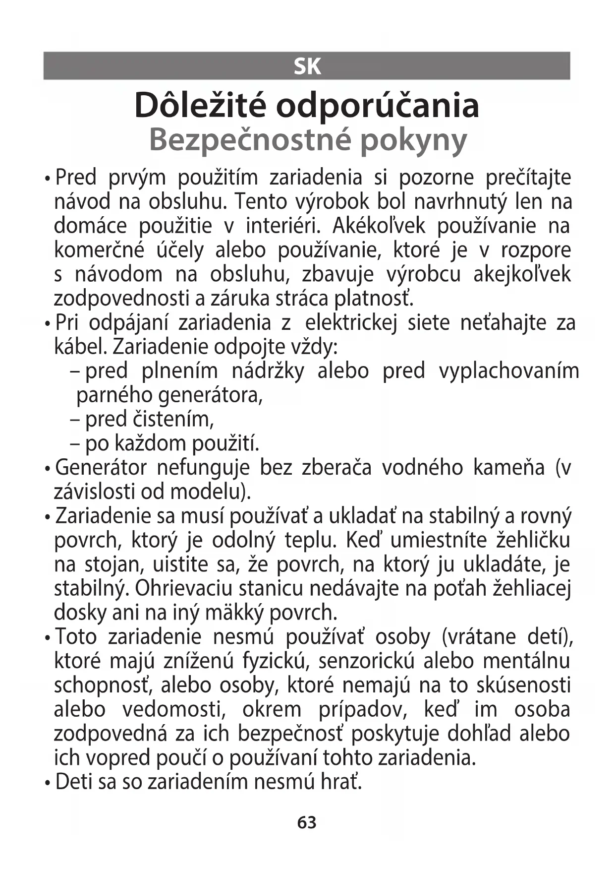 - Toto zariadenie môžu používať deti staršie ako 8 rokov a osoby, ktoré nemajú na to skúsenosti alebo vedomosti, alebo osoby, ktoré majú zníženú fyzickú, senzorickú alebo mentálnu schopnosť, len v tom prípade, ak sú oboznámené s bezpečným používaním zariadenia, ak sú pod dozorom a ak poznajú prípadné riziká. Dbajte na to, aby sa deti s týmto zariadením nehrali. Deti nesmú bez dozoru zariadenie ani čistiť, ani vykonávať jeho údržbu. Žehličku a kábel uchovávajte mimo dosahu detí mladších ako 8 rokov, keď je žehlička pod napätím alebo počas chladnutia.