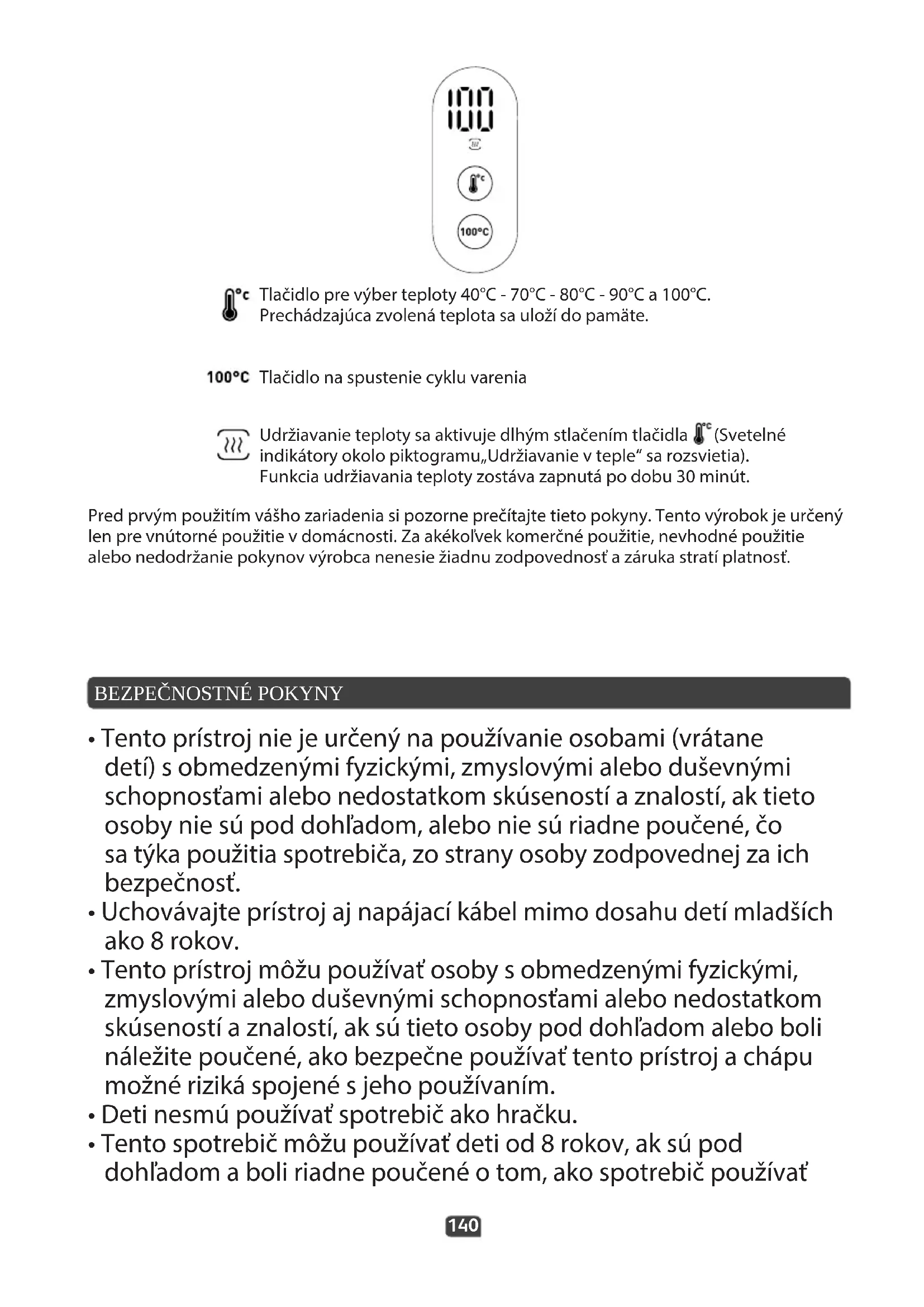 Pred prvým použitím vášho zariadenia si pozorne prečítajte tieto pokyny. Tento výrobok je určený len pre vnútorné použitie v domácnosti. Za akékoľvek komerčné použitie, nevhodné použitie alebo nedodržanie pokynov výrobca nenesie žiadnu zodpovednosť a záruka stratí platnosť. Tlačidlo pre výber teploty 40°C - 70°C - 80°C - 90°C a 100°C. Prechádzajúca zvolená teplota sa uloží do pamäte. Tlačidlo na spustenie cyklu varenia Udržiavanie teploty sa aktivuje dlhým stlačením tlačidla (Svetelné indikátory okolo piktogramu„Udržiavanie v teple“ sa rozsvietia). Funkcia udržiavania teploty zostáva zapnutá po dobu 30 minút.141 bezpečným spôsobom a chápu možné riziká spojené s jeho používaním. Čistenie a údržbu nesmú vykonávať deti mladšie ako 8 rokov a ktoré nie sú pod dohľadom dospelej osoby.