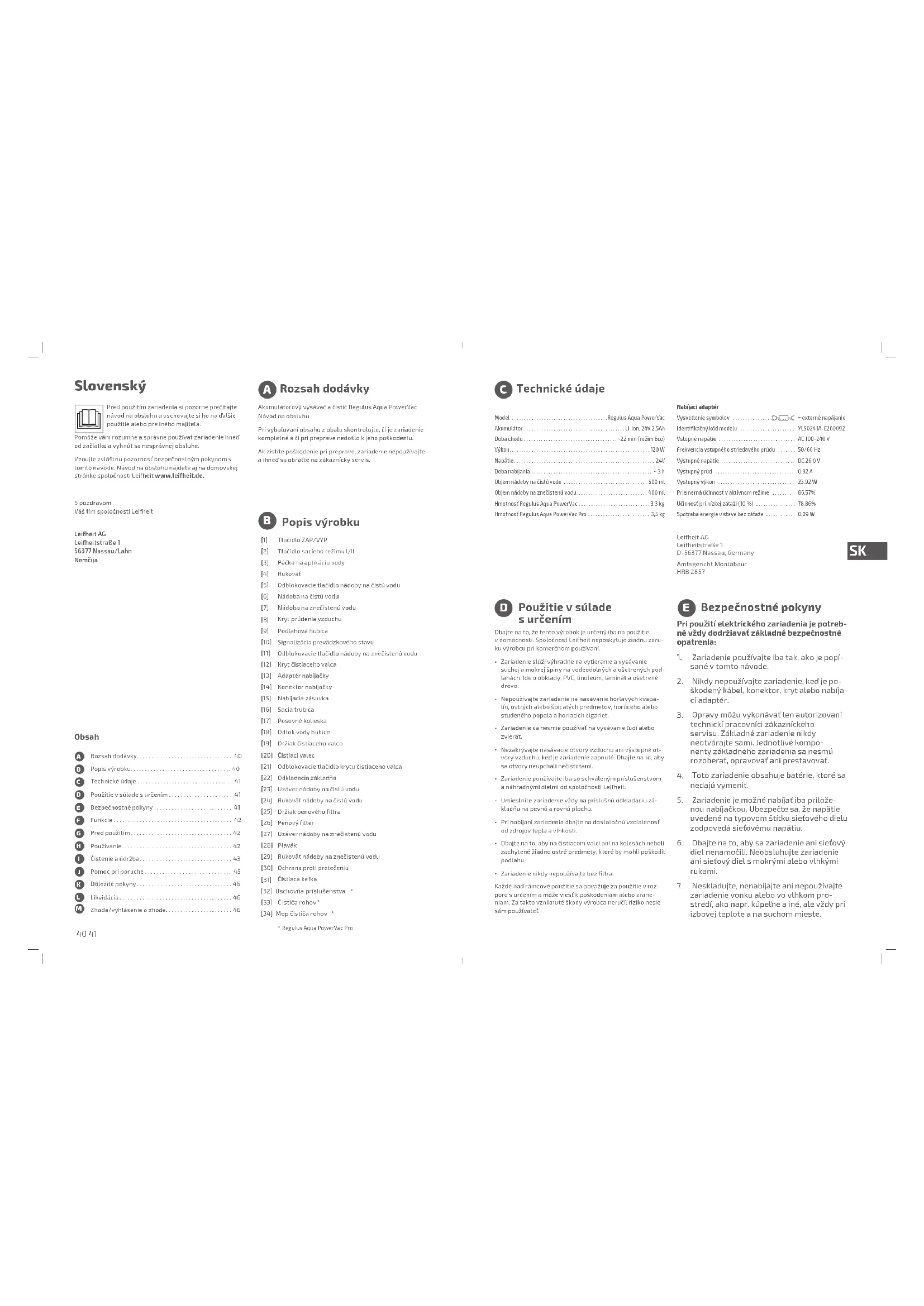 Pred použitím zariadenia si pozorne prečítajte návod na obsluhu a uschovajte si ho na ďalšie použitie alebo pre iného majiteľa. Pomôže vám rozumne a správne používať zariadenie hneď od začiatku a vyhnúť sa nesprávnej obsluhe.Venujte zvláštnu pozornosť bezpečnostným pokynom v tomto návode. Návod na obsluhu nájdete aj na domovskej stránke spoločnosti Leifheit www.leifheit.de.S pozdravom Váš tím spoločnosti LeifheitLeifheit AG Leifheitstraße 1 56377 Nassau/Lahn Nemčija Obsah