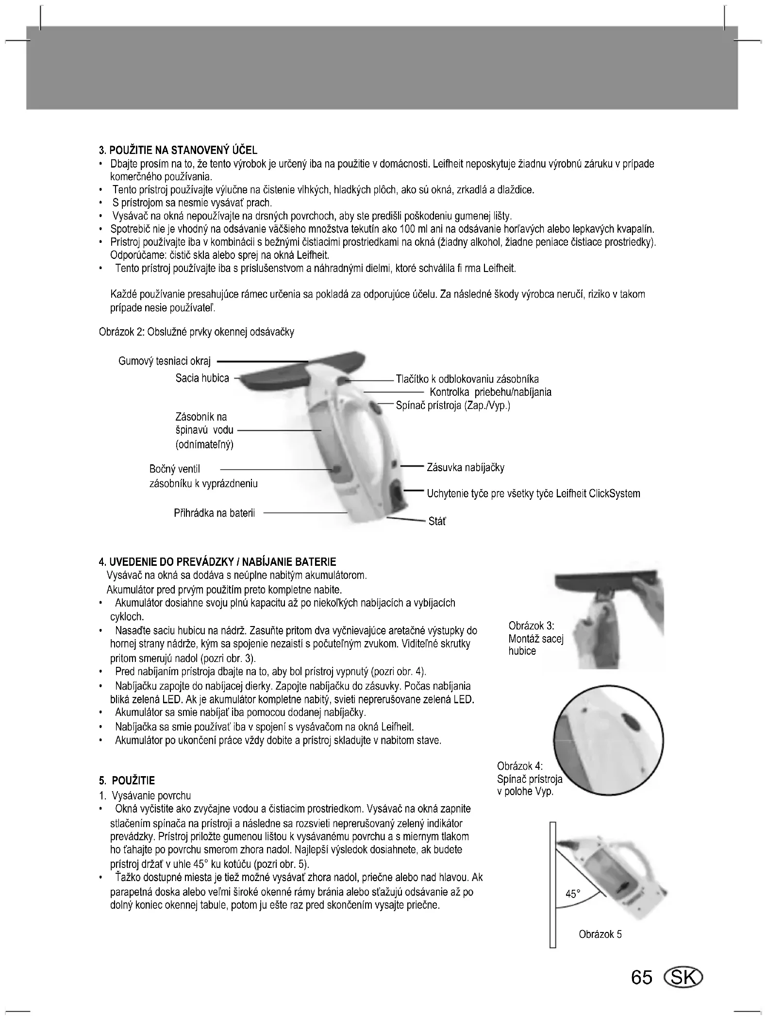 - Oknávyčistiteakozvyčajnevodouačistiacimprostriedkom.Vysávačnaoknázapnite stlačenímspínačanaprístrojianáslednesarozsvietineprerušovanýzelenýindikátor prevádzky.Prístrojpriložtegumenoulištoukvysávanémupovrchuasmiernymtlakom hoťahajtepopovrchusmeromzhoranadol.Najlepšívýsledokdosiahnete,akbudete prístrojdržaťvuhle45°kukotúču(pozriobr.5).