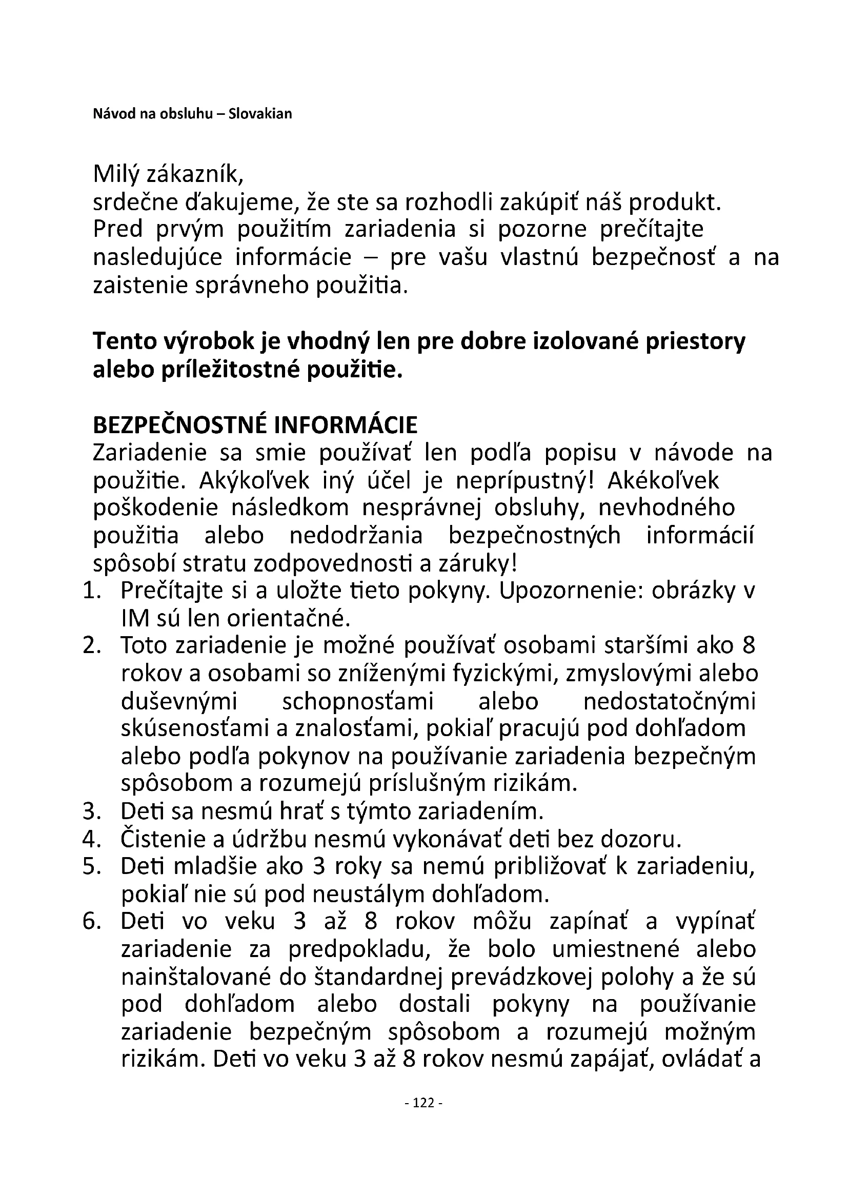 Spĺňa požiadavky smerníc Rady: NARIADENIE KOMISIE (EÚ) č. 2015/1188 zo dňa 28. apríla 2015, ktorým sa mení NARIADENIE KOMISIE (EÚ) 2016/2282 a ktorým sa implementuje smernica 2009/125/ES Európskeho parlamentu a Rady o požiadavkách na ekodizajn lokálnych ohrievačov Čo sa týka informovania spotrebiteľov o tom, ako inštalovať, používať a udržiavať výrobok a informácie o OEEZ si pozrite v návode na obsluhu dodanom s balením.- 129 - Priročnik za uporabo – Slovenian Spoštovani kupec, zahvaljujemo se vam, da ste izbrali naš izdelek. Zaradi vaše varnosti in zagotovitve pravilne uporabe pred zagonom naprave pozorno preberite podatke v nadaljevanju. Ta izdelek je primeren le za dobro izolirane prostore ali občasno uporabo.