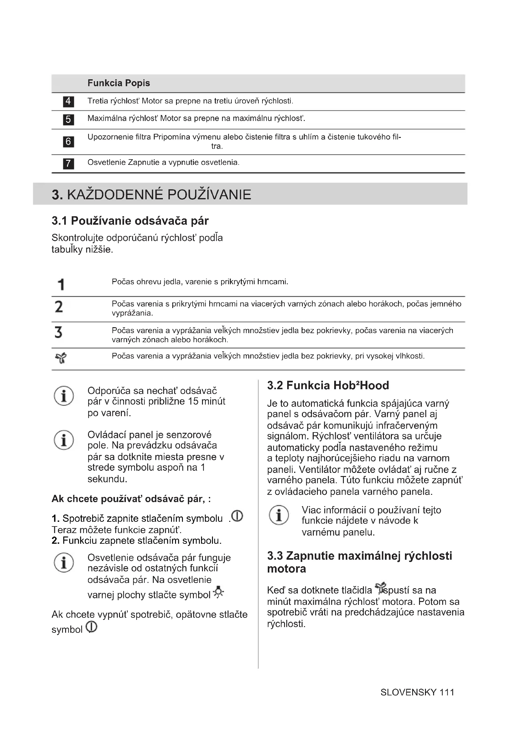 Funkcia Popis Zap./Vyp. Zapnutie a vypnutie odsávača pár. Prvá rýchlosť Motor sa prepne na prvú úroveň rýchlosti. Druhá rýchlosť Motor sa prepne na druhú úroveň rýchlosti.110 SLOVENSKYFunkcia Popis