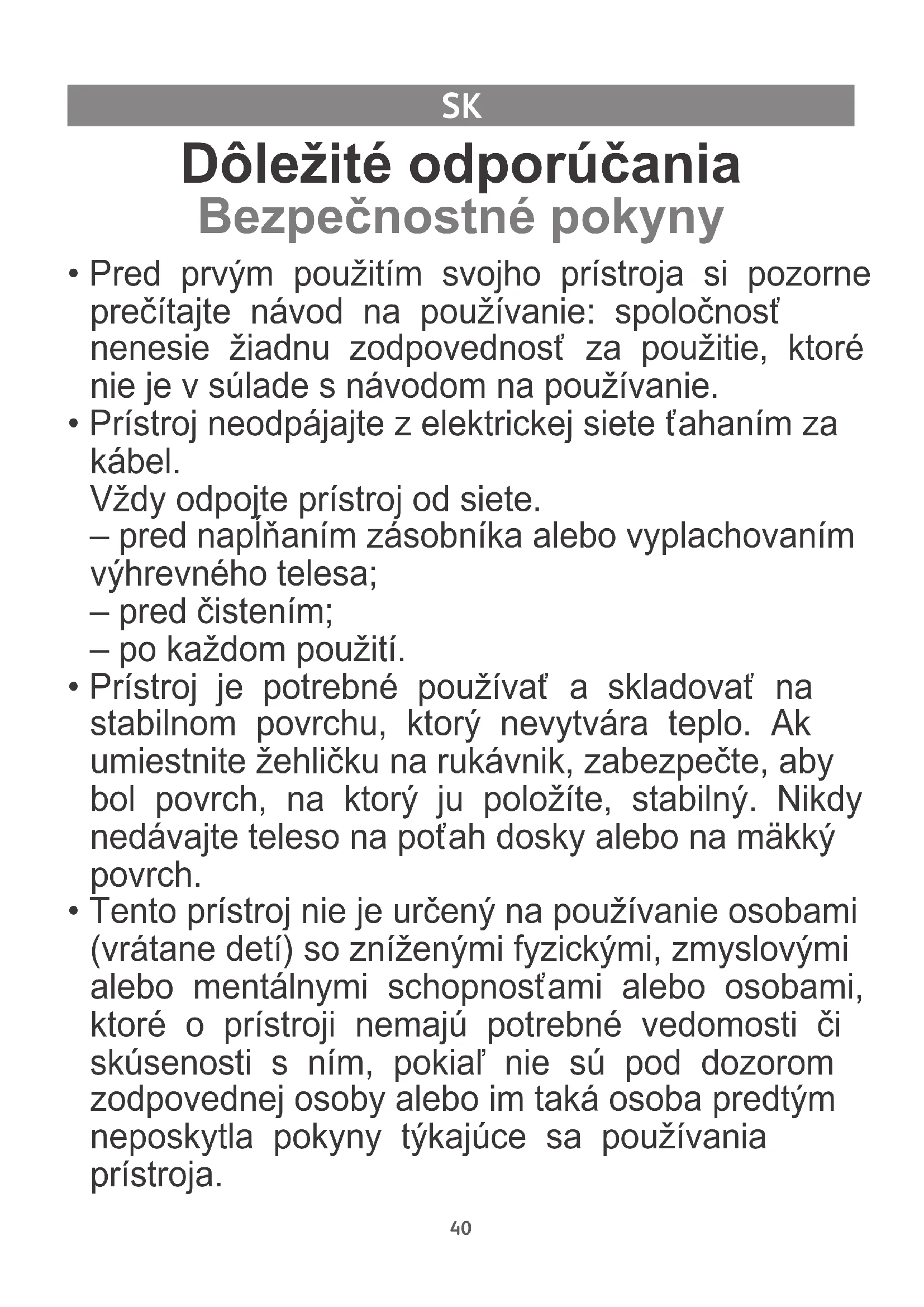 - Tento prístroj môžu používať deti od 8 rokov a osoby, ktoré nemajú skúsenosti a vedomosti alebo osoby so zníženými fyzickými, zmyslovými a duševnými schopnosťami, ak sú poučené a informované o tom, že bezpečné použitie prístroja nesie riziká. Deti sa nesmú hrať s prístrojom. Čistenie a údržbu používateľom nesmú vykonávať deti, ktoré sú mladšie ako 8 rokov a jedine pod dohľadom. Uchovávajte prístroj a jeho kábel mimo dosahu detí, ktoré sú mladšie ako 8 rokov.