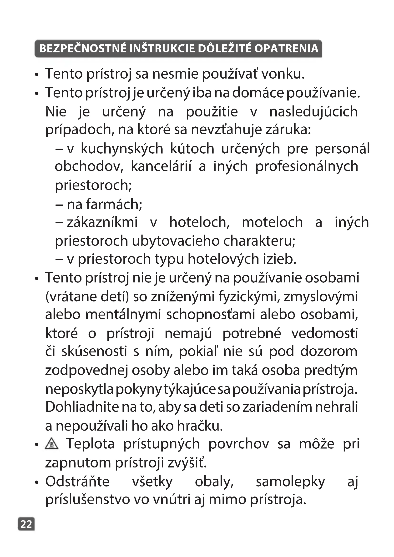 - Tento prístroj je určený iba na domáce používanie. Nie je určený na použitie v nasledujúcich prípadoch, na ktoré sa nevzťahuje záruka: – v kuchynských kútoch určených pre personál obchodov, kancelárií a iných profesionálnych priestoroch; – na farmách; – zákazníkmi v hoteloch, moteloch a iných priestoroch ubytovacieho charakteru; – v priestoroch typu hotelových izieb.