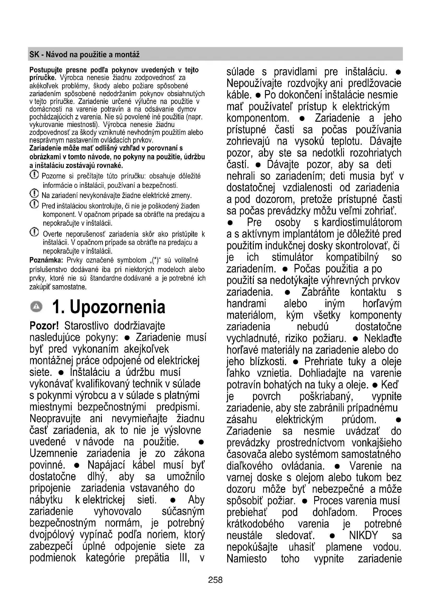 Pozor! Starostlivo dodržiavajte nasledujúce pokyny: ● Zariadenie musí byť pred vykonaním akejkoľvek montážnej práce odpojené od elektrickej siete. ● Inštaláciu a údržbu musí vykonávať kvalifikovaný technik v súlade s pokynmi výrobcu a v súlade s platnými miestnymi bezpečnostnými predpismi. Neopravujte ani nevymieňajte žiadnu časť zariadenia, ak to nie je výslovne uvedené v návode na použitie. ● Uzemnenie zariadenia je zo zákona povinné. ● Napájací kábel musí byť dostatočne dlhý, aby sa umožnilo pripojenie zariadenia vstavaného do nábytku k elektrickej sieti. ● Aby zariadenie vyhovovalo súčasným bezpečnostným normám, je potrebný dvojpólový vypínač podľa noriem, ktorý zabezpečí úplné odpojenie siete za podmienok kategórie prepätia III, v súlade s pravidlami pre inštaláciu. ● Nepoužívajte rozdvojky ani predlžovacie káble. ● Po dokončení inštalácie nesmie mať používateľ prístup k elektrickým komponentom. ● Zariadenie a jeho prístupné časti sa počas používania zohrievajú na vysokú teplotu. Dávajte pozor, aby ste sa nedotkli rozohriatych častí. ● Dávajte pozor, aby sa deti nehrali so zariadením; deti musia byť v dostatočnej vzdialenosti od zariadenia a pod dozorom, pretože prístupné časti sa počas prevádzky môžu veľmi zohriať. ● Pre osoby s kardiostimulátorom a s aktívnym implantátom je dôležité pred použitím indukčnej dosky skontrolovať, či je ich stimulátor kompatibilný so zariadením. ● Počas použitia a po použití sa nedotýkajte výhrevných prvkov zariadenia. ● Zabráňte kontaktu s handrami alebo iným horľavým materiálom, kým všetky komponenty zariadenia nebudú dostatočne vychladnuté, riziko požiaru. ● Neklaďte horľavé materiály na zariadenie alebo do jeho blízkosti. ● Prehriate tuky a oleje ľahko vznietia. Dohliadajte na varenie potravín bohatých na tuky a oleje. ● Keď je povrch poškriabaný, vypnite zariadenie, aby ste zabránili prípadnému zásahu elektrickým prúdom. ● Zariadenie sa nesmie uvádzať do prevádzky prostredníctvom vonkajšieho časovača alebo systémom samostatného diaľkového ovládania. ● Varenie na varnej doske s olejom alebo tukom bez dozoru môže byť nebezpečné a môže spôsobiť požiar. ● Proces varenia musí prebiehať pod dohľadom. Proces krátkodobého varenia je potrebné neustále sledovať. ● NIKDY sa nepokúšajte uhasiť plamene vodou. Namiesto toho vypnite zariadenie259 a zakryte plameň napríklad vekom alebo hasiacou pokrývkou. Nebezpečenstvo požiaru: neukladajte predmety na varnú dosku. ● Nepoužívajte parné čističe, existuje riziko úrazu elektrickým prúdom. ● Neukladajte magnetické predmety ako nože, vidličky, lyžice na povrch varnej dosky, pretože by sa mohli prehriať. ● Pred pripojením zariadenia k elektrickej sieti: skontrolujte identifikačný štítok (umiestnený na spodnej časti zariadenia), aby ste sa uistili, že napätie a výkon zodpovedajú hodnotám siete a že elektrická zásuvka je vhodná. V prípade pochybností kontaktujte kvalifikovaného elektrikára. Dôležité: ● Po použití vypnite varnú dosku ovládacím zariadením a nespoliehajte sa na detektor prítomnosti hrnca. ● Zabráňte rozliatiu tekutín, preto pri uvádzaní tekutín do varu alebo pri ich ohrievaní znížte prívod tepla. ● Nenechávajte ohrievacie prvky zapnuté, keď sú na nich uložené prázdne hrnce alebo panvice, alebo keď na nich nie sú uložené žiadne nádoby. ● Po dokončení varenia vypnite príslušnú varnú zónu. ● Na varenie nikdy nepoužívajte hliníkovú fóliu a nikdy na dosku priamo neumiestňujte výrobky balené do hliníka. Došlo by k roztopeniu hliníka a nenapraviteľnému poškodeniu vášho zariadenia. ● Nikdy neohrievajte neotvorenú konzervu alebo plechovú nádobu s potravinami: môže vybuchnúť! Toto upozornenie platí pre všetky ostatné druhy varných dosiek. ● Použitie vysokého výkonu, ako je funkcia Booster, nie je vhodné pre zohrievanie niektorých tekutín, ako napríklad olej na vyprážanie. Nadmerné teplo by mohlo byť nebezpečné. V týchto prípadoch odporúčame použiť nižší výkon. ● Nádoby musia byť umiestnené priamo na varnej ploche a musia byť v strede. V žiadnom prípade nevkladajte medzi hrniec a varnú dosku iné predmety. ● V prípade vysokých teplôt zariadenie automatický zníži stupeň výkonu varných zón. ● Skôr ako vykonáte akýkoľvek úkon čistenia alebo údržby, zariadenie odpojte z elektrickej siete vytiahnutím zástrčky alebo vypnutím hlavného vypínača obydlia. ● Pri všetkých úkonoch montáže a údržby používajte pracovné rukavice. ● Zariadenie smú používať deti staršie ako 8 rokov a osoby s obmedzenými fyzickými, zmyslovými alebo mentálnymi schopnosťami alebo bez skúseností alebo potrebných znalostí len vtedy, keď sú pod dozorom alebo keď im boli dané pokyny týkajúce sa bezpečného používania zariadenia a tieto osoby pochopili nebezpečenstvá spojené so zariadením. ● Deti musia byť pod dozorom, aby sa so zariadením nehrali. ● Čistenie a údržbu nesmú vykonávať deti bez dozoru. ● V miestnosti musí byť zabezpečené dostatočné vetranie, keď sa zariadenie používa súčasne s ďalšími spaľovacími zariadeniami na plyn alebo iné palivá. ● Zariadenie sa musí často čistiť, zvnútra aj zvonku (ASPOŇ RAZ ZA MESIAC), v každom prípade dodržiavajte pokyny výslovne uvedené v pokynoch na údržbu. ● Nedodržanie postupov čistenia zariadenia a výmeny a čistenia filtrov spôsobuje riziká požiarov. ● Varenie na spôsob flambovania je prísne zakázané. ● Použitie otvoreného ohňa je škodlivé pre filtre a môže vyvolať požiar, preto sa mu vždy vyhýbajte. ● Vyprážanie je nutné vykonávať pod dozorom, aby sa zabránilo zapáleniu prehriateho olej