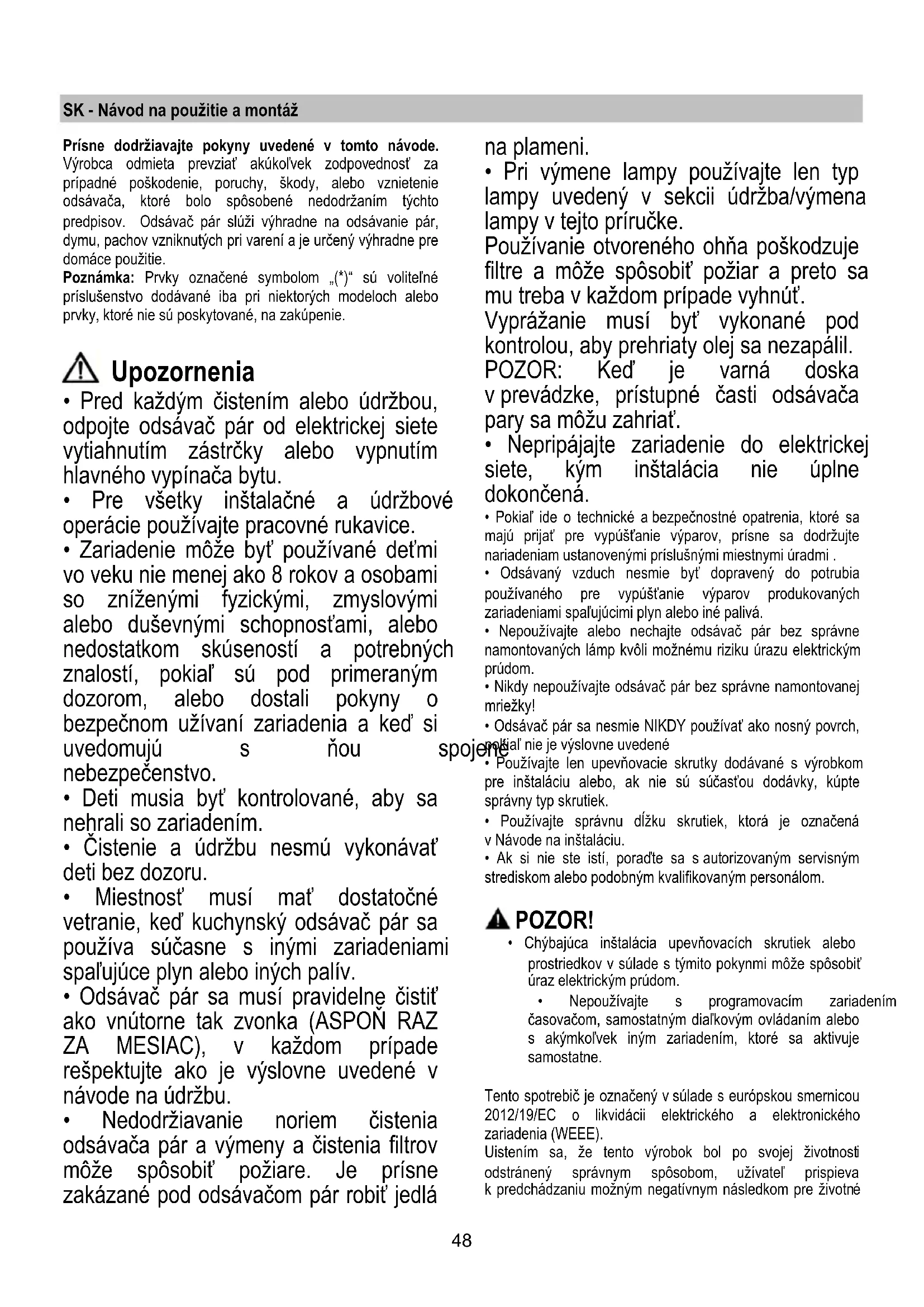 - Pri výmene lampy používajte len typ lampy uvedený v sekcii údržba/výmena lampy v tejto príručke. Používanie otvoreného ohňa poškodzuje filtre a môže spôsobiť požiar a preto sa mu treba v každom prípade vyhnúť. Vyprážanie musí byť vykonané pod kontrolou, aby prehriaty olej sa nezapálil. POZOR: Keď je varná doska v prevádzke, prístupné časti odsávača pary sa môžu zahriať.