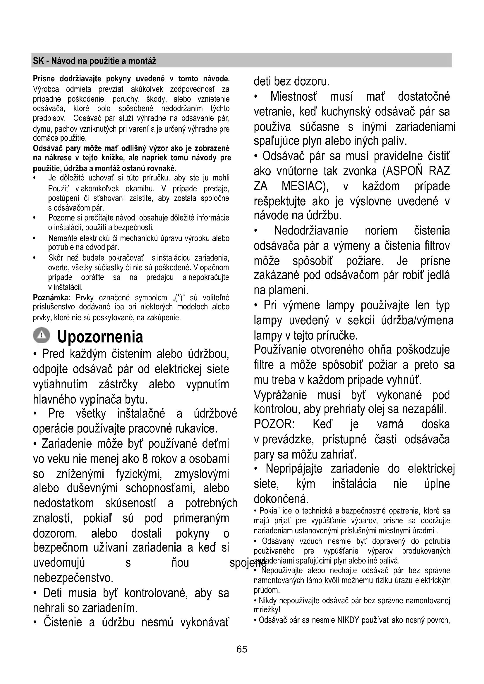 - Miestnosť musí mať dostatočné vetranie, keď kuchynský odsávač pár sa používa súčasne s inými zariadeniami spaľujúce plyn alebo iných palív.