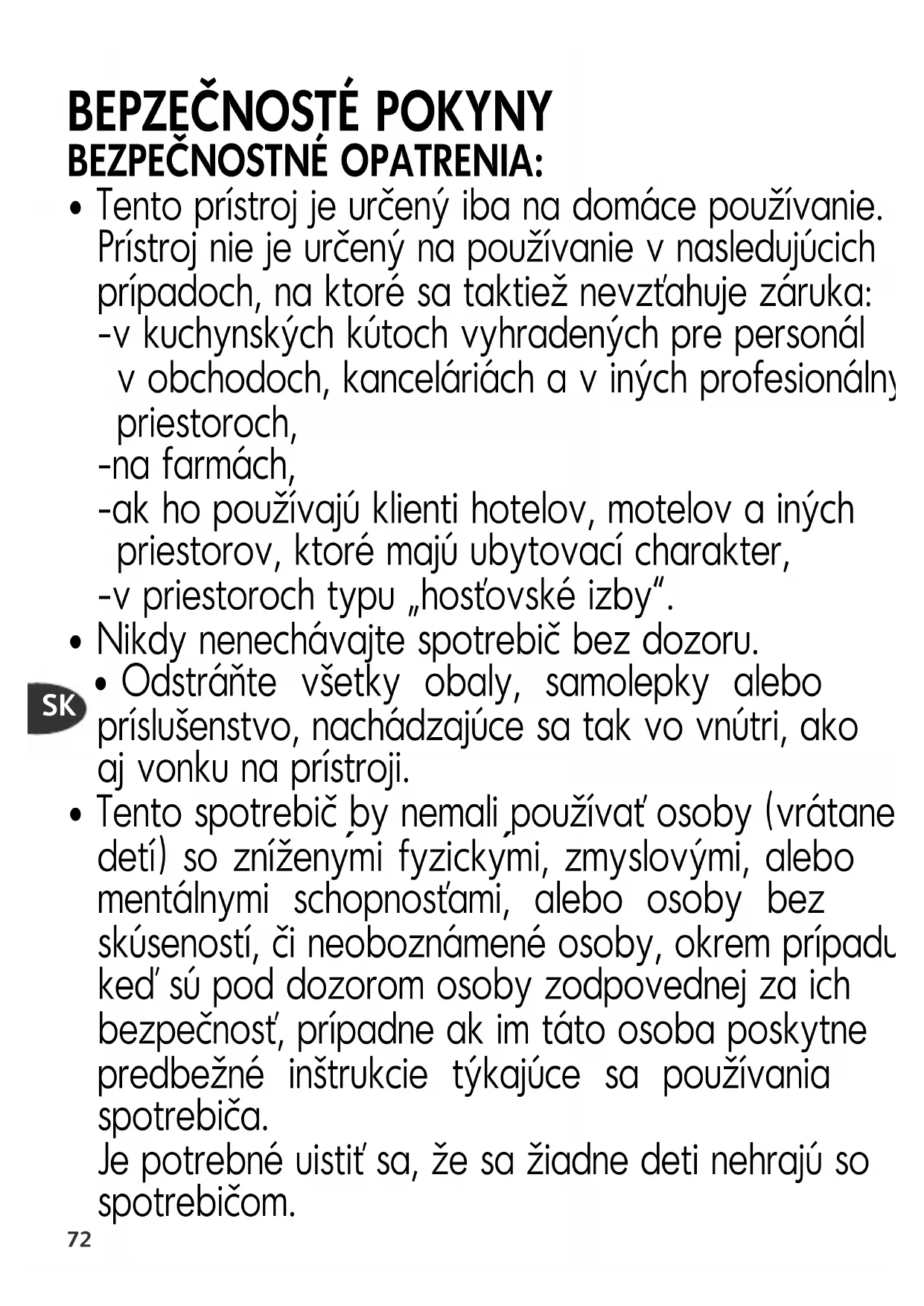 - Tento prístroj je určený iba na domáce používanie. Prístroj nie je určený na používanie v nasledujúcich prípadoch, na ktoré sa taktiež nevzťahuje záruka: -v kuchynských kútoch vyhradených pre personál v obchodoch, kanceláriách a v iných profesionálnych priestoroch, -na farmách, -ak ho používajú klienti hotelov, motelov a iných priestorov, ktoré majú ubytovací charakter, -v priestoroch typu „hosťovské izby“.