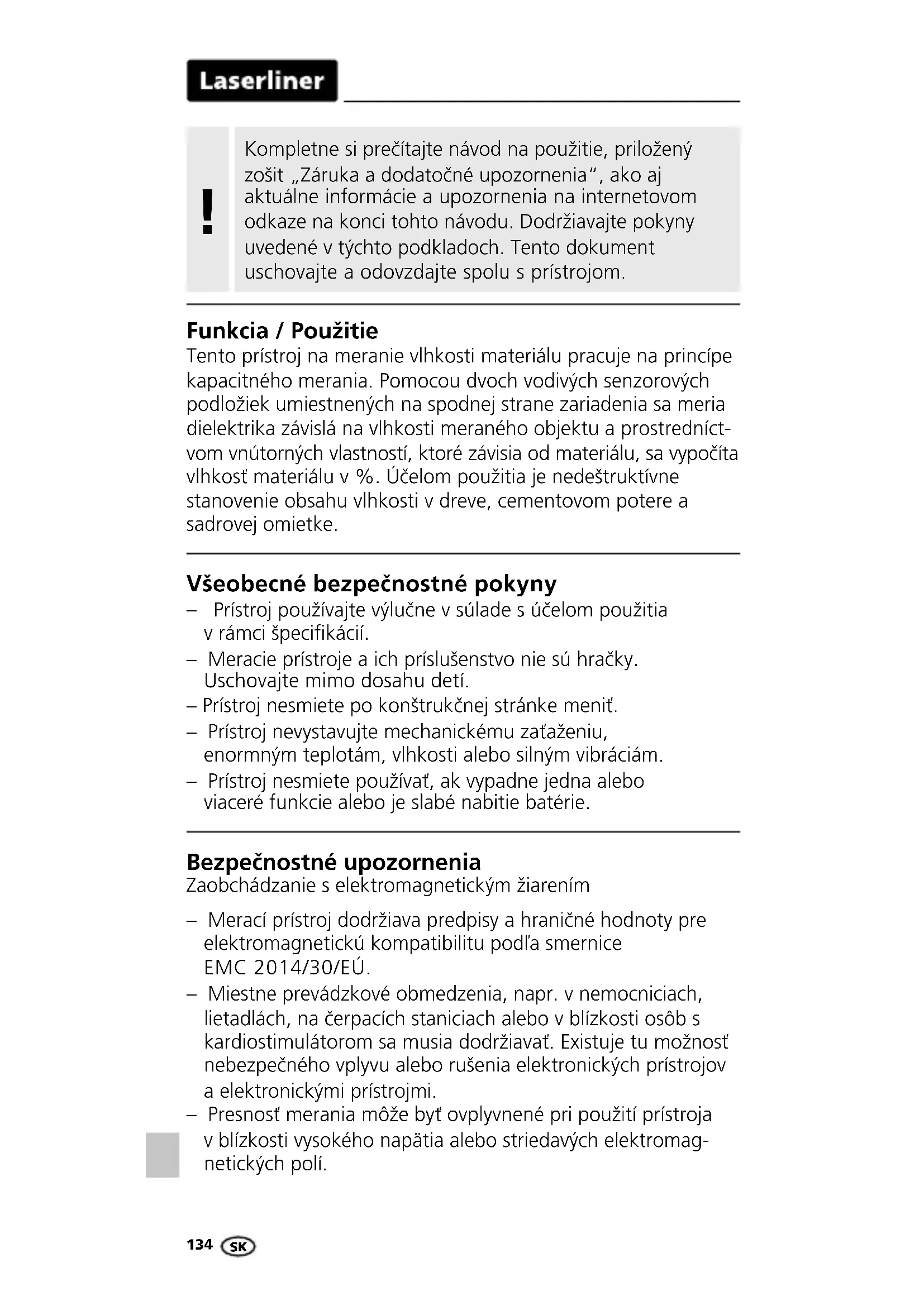 Funkcia / Použitie Tento prístroj na meranie vlhkosti materiálu pracuje na princípe kapacitného merania. Pomocou dvoch vodivých senzorových podložiek umiestnených na spodnej strane zariadenia sa meria dielektrika závislá na vlhkosti meraného objektu a prostredníct- vom vnútorných vlastností, ktoré závisia od materiálu, sa vypočíta vlhkosť materiálu v %. Účelom použitia je nedeštruktívne stanovenie obsahu vlhkosti v dreve, cementovom potere a sadrovej omietke. Všeobecné bezpečnostné pokyny – Prístroj používajte výlučne v súlade s účelom použitia v rámci špecikácií. – Meracie prístroje a ich príslušenstvo nie sú hračky. Uschovajte mimo dosahu detí. – Prístroj nesmiete po konštrukčnej stránke meniť. – Prístroj nevystavujte mechanickému zaťaženiu, enormným teplotám, vlhkosti alebo silným vibráciám. – Prístroj nesmiete používať, ak vypadne jedna alebo viaceré funkcie alebo je slabé nabitie batérie. Bezpečnostné upozornenia Zaobchádzanie s elektromagnetickým žiarením – Merací prístroj dodržiava predpisy a hraničné hodnoty pre elektromagnetickú kompatibilitu podľa smernice EMC 2014/30/EÚ. – Miestne prevádzkové obmedzenia, napr. v nemocniciach, lietadlách, na čerpacích staniciach alebo v blízkosti osôb s kardiostimulátorom sa musia dodržiavať. Existuje tu možnosť nebezpečného vplyvu alebo rušenia elektronických prístrojov a elektronickými prístrojmi. – Presnosť merania môže byť ovplyvnené pri použití prístroja v blízkosti vysokého napätia alebo striedavých elektromag- netických polí.MoistureFinder Compact