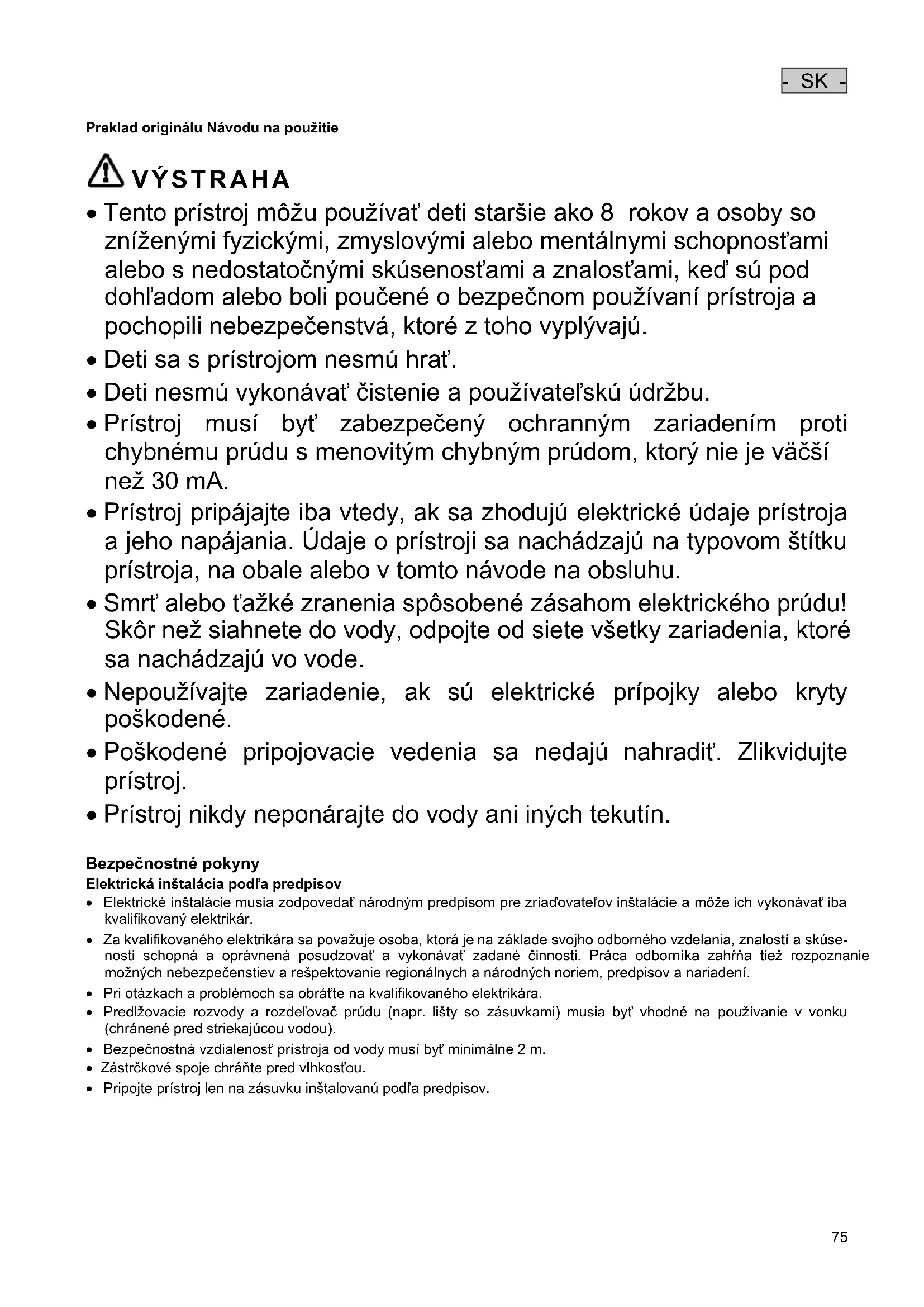 - Prístroj nikdy neponárajte do vody ani iných tekutín. Bezpečnostné pokyny Elektrická inštalácia podľa predpisov