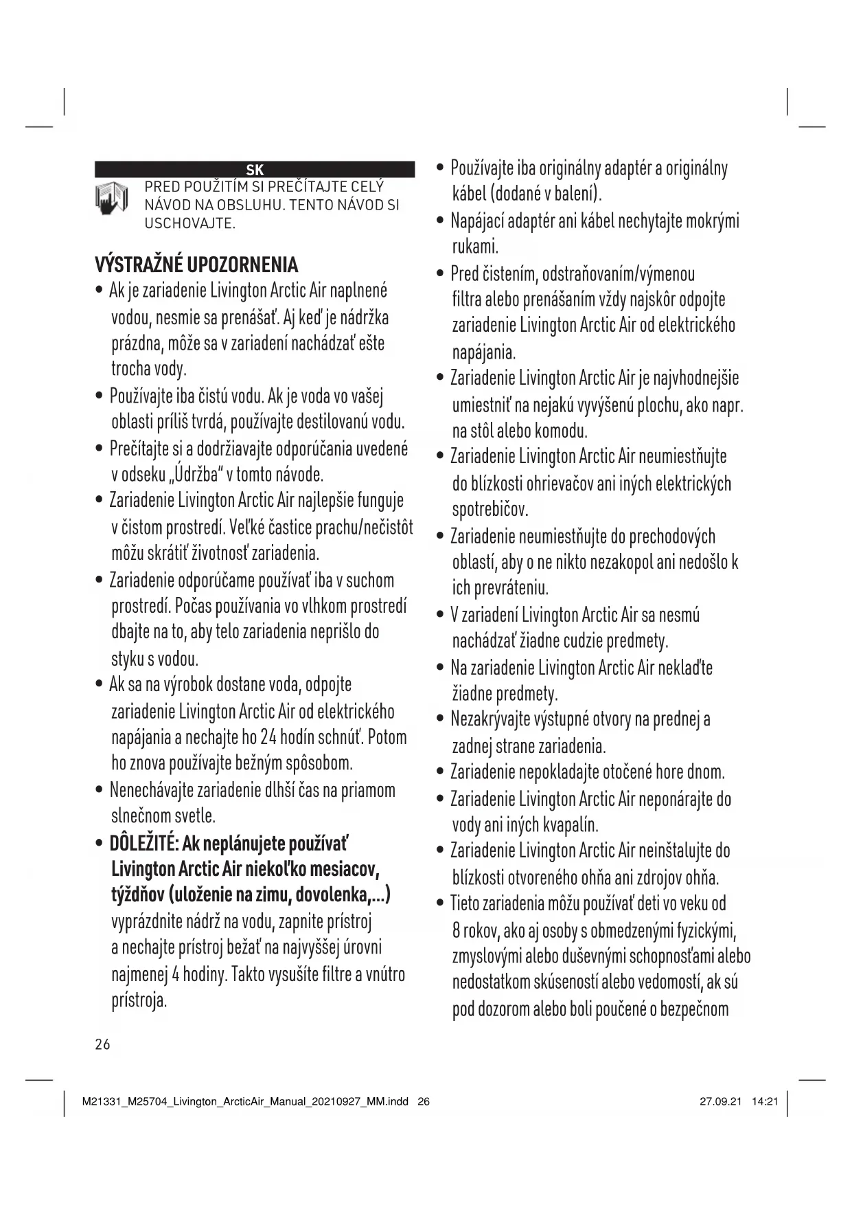 - Tieto zariadenia môžu používať deti vo veku od 8 rokov, ako aj osoby s obmedzenými fyzickými, zmyslovými alebo duševnými schopnosťami alebo nedostatkom skúseností alebo vedomostí, ak sú pod dozorom alebo boli poučené o bezpečnom M21331_M25704_Livington_ArcticAir_Manual_20210927_MM.indd 26M21331_M25704_Livington_ArcticAir_Manual_20210927_MM.indd 26 27.09.21 14:2127.09.21 14:2127 používaní zariadenia a pochopili nebezpečenstvá, ktoré z toho vyplývajú. Deti sa nesmú hrať s prístrojom. Čistenie a používateľskú údržbu nesmú vykonávať deti, ak nie sú staršie ako 8 rokov a nie sú pod dozorom. Zariadenie a pripájacie káble sa musia uchovávať mimo dosahu detí mladších ako 8 rokov. Zvýšte opatrnosť najmä vtedy, keď sa klimatizačné zariadenie používa v blízkosti detí a keď ho nechávate zapnuté bez dozoru.
