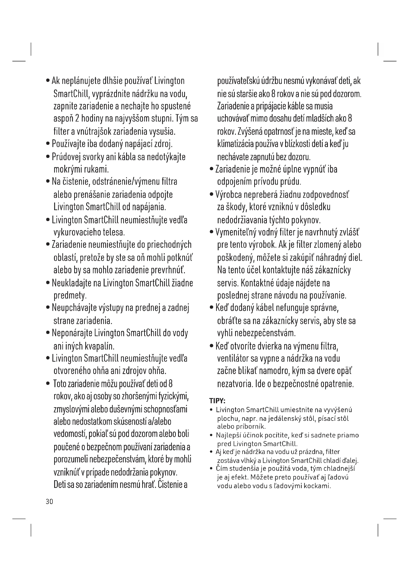 - Ak neplánujete dlhšie používať Livington SmartChill, vyprázdnite nádržku na vodu, zapnite zariadenie a nechajte ho spustené aspoň 2 hodiny na najvyššom stupni. Tým sa filter a vnútrajšok zariadenia vysušia.