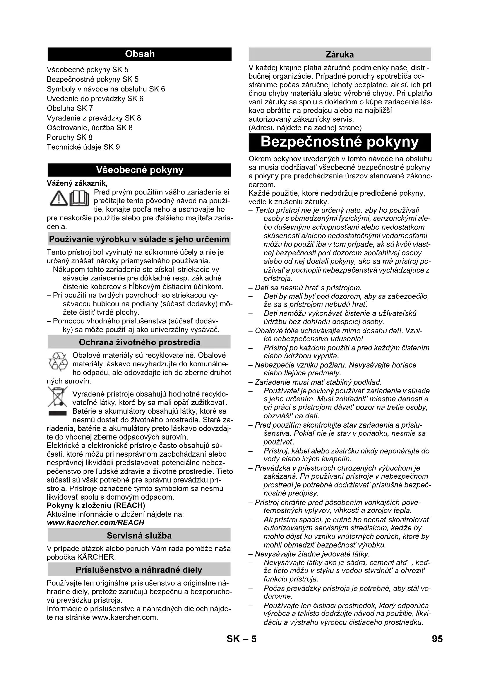 Siguranţă pentru reţea (tem- porizată) 10 A Volumul rezervorului 18 l Capacitate pentru apă, max. 4 l Puterea P nominal 1200 W Puterea P max 1400 W Cablu de reţea H05-VV-F2x0,75 Nivelul de zgomot (EN 60704-2-1) 74 dB(A) 94 RO– 5 Vážený zákazník, Pred prvým použitím vášho zariadenia si prečítajte tento pôvodný návod na použi- tie, konajte podľa neho a uschovajte ho pre neskoršie použitie alebo pre ďalšieho majiteľa zaria- denia. Tento prístroj bol vyvinutý na súkromné účely a nie je určený znášať nároky priemyselného používania. – Nákupom tohto zariadenia ste získali striekacie vy- sávacie zariadenie pre dôkladné resp. základné čistenie kobercov s hĺbkovým čistiacim účinkom. – Pri použití na tvrdých povrchoch so striekacou vy- sávacou hubicou na podlahy (súčasť dodávky) mô- žete čistiť tvrdé plochy. – Pomocou vhodného príslušenstva (súčasť dodáv- ky) sa môže použiť aj ako univerzálny vysávač. Obalové materiály sú recyklovateľné. Obalové materiály láskavo nevyhadzujte do komunálne- ho odpadu, ale odovzdajte ich do zberne druhot- ných surovín. Vyradené prístroje obsahujú hodnotné recyklo- vateľné látky, ktoré by sa mali opäť zužitkovať. Batérie a akumulátory obsahujú látky, ktoré sa nesmú dostať do životného prostredia. Staré za- riadenia, batérie a akumulátory preto láskavo odovzdaj- te do vhodnej zberne odpadových surovín. Elektrické a elektronické prístroje často obsahujú sú- časti, ktoré môžu pri nesprávnom zaobchádzaní alebo nesprávnej likvidácii predstavovať potenciálne nebez- pečenstvo pre ľudské zdravie a životné prostredie. Tieto súčasti sú však potrebné pre správnu prevádzku prí- stroja. Prístroje označené týmto symbolom sa nesmú likvidovať spolu s domovým odpadom. Pokyny k zloženiu (REACH) Aktuálne informácie o zložení nájdete na: www.kaercher.com/REACH V prípade otázok alebo porúch Vám rada pomôže naša pobočka KÄRCHER. Používajte len originálne príslušenstvo a originálne ná- hradné diely, pretože zaručujú bezpečnú a bezporucho- vú prevádzku prístroja. Informácie o príslušenstve a náhradných dieloch nájde- te na stránke www.kaercher.com. V každej krajine platia záručné podmienky našej distri- bučnej organizácie. Prípadné poruchy spotrebiča od- stránime počas záručnej lehoty bezplatne, ak sú ich prí- činou chyby materiálu alebo výrobné chyby. Pri uplatňo- vaní záruky sa spolu s dokladom o kúpe zariadenia lás- kavo obráťte na predajcu alebo na najbližší autorizovaný zákaznícky servis. (Adresu nájdete na zadnej strane) Okrem pokynov uvedených v tomto návode na obsluhu sa musia dodržiavat' všeobecné bezpečnostné pokyny a pokyny pre predchádzanie úrazov stanovené zákono- darcom. Každé použitie, ktoré nedodržuje predložené pokyny, vedie k zrušeniu záruky. – Tento prístroj nie je určený nato, aby ho používali osoby s obmedzenými fyzickými, senzorickými ale- bo duševnými schopnosťami alebo nedostatkom skúseností a/alebo nedostatočnými vedomosťami, môžu ho použiť iba v tom prípade, ak sú kvôli vlast- nej bezpečnosti pod dozorom spoľahlivej osoby alebo od nej dostali pokyny, ako sa má prístroj po- užívať a pochopili nebezpečenstvá vychádzajúce z prístroja. – Deti sa nesmú hrať s prístrojom. – Deti by mali byť pod dozorom, aby sa zabezpečilo, že sa s prístrojom nebudú hrať. – Deti nemôžu vykonávať čistenie a užívateľskú údržbu bez dohľadu dospelej osoby. – Obalové fólie uchovávajte mimo dosahu detí. Vzni- ká nebezpečenstvo udusenia! – Prístroj po každom použití a pred každým čistením alebo údržbou vypnite. – Nebezpečie vzniku požiaru. Nevysávajte horiace alebo tlejúce predmety. – Zariadenie musí mať stabilný podklad. – Používateľ je povinný používat' zariadenie v súlade s jeho určením. Musí zohľadnit' miestne danosti a pri práci s prístrojom dávat' pozor na tretie osoby, obzvlášt' na deti. – Pred použitím skontrolujte stav zariadenia a príslu- šenstva. Pokiaľ nie je stav v poriadku, nesmie sa používať. – Prístroj, kábel alebo zástrčku nikdy neponárajte do vody alebo iných kvapalín. – Prevádzka v priestoroch ohrozených výbuchom je zakázaná. Pri používaní prístroja v nebezpečnom prostredí je potrebné dodržiavat' príslušné bezpeč- nostné predpisy. – Prístroj chráňte pred pôsobením vonkajších pove- ternostných vplyvov, vlhkosti a zdrojov tepla. – Ak prístroj spadol, je nutné ho nechať skontrolovať autorizovaným servisným strediskom, keďže by mohlo dôjsť ku vzniku vnútorných porúch, ktoré by mohli obmedziť bezpečnosť výrobku. – Nevysávajte žiadne jedovaté látky. – Nevysávajte látky ako je sádra, cement atď. , keď- že tieto môžu v styku s vodou stvrdnút' a ohrozit' funkciu prístroja. – Počas prevádzky prístroja je potrebné, aby stál vo- dorovne. – Používajte len čistiaci prostriedok, ktorý odporúča výrobca a takisto dodržujte návod na použitie, likvi- dáciu a výstrahu výrobcu čistiaceho prostriedku. Obsah Všeobecné pokyny SK 5 Bezpečnostné pokyny SK 5 Symboly v návode na obsluhu SK 6 Uvedenie do prevádzky SK 6 Obsluha SK 7 Vyradenie z prevádzky SK 8 Ošetrovanie, údržba SK 8 Poruchy SK 8 Technické údaje SK 9 Všeobecné pokyny Používanie výrobku v súlade s jeho určením Ochrana životného prostredia Servisná služba Príslušenstvo a náhradné diely Záruka Bezpečnostné pokyny 95SK– 6 몇 NEBEZPEČENSTVO – Prístroj zapájajte iba do riadne uzemnených zásu- viek. – Zariadenie pripájajte iba na striedavý prúd. Napätie musí zodpovedať údajom na typovom štítku zaria- denia. – Nikdy sa nedotýkajte sieťovej zásuvky a vidlice vlh- kými rukami. – Sieťovú zástrčku neťahajte zo zásu