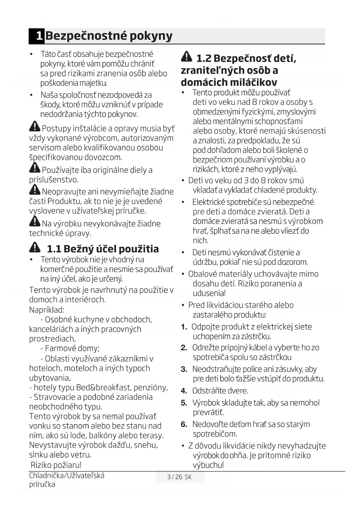 Vážení zákazníci, Pred použitím produktu si pozorne prečítajte tento návod na obsluhu. Ďakujeme, že ste si vybrali tento výrobok. Boli by sme radi, keby ste dosiahli optimálnu účinnosť tohto vysoko kvalitného výrobku, ktorý bol vyrobený pomocou najmodernejších technológií. Pred použitím produktu si pozorne prečítajte tento návod a všetku dodanú dokumentáciu a uschovajte si ju ako referenciu. Dbajte na všetky informácie a varovania uvedené v používateľskej príručke. Týmto spôsobom budete chrániť seba a svoj výrobok pred možnými nebezpečenstvami. Uschovajte si tento návod na obsluhu. Priložte túto príručku k spotrebiči, ak ho odovzdáte niekomu inému. V užívateľskej príručke sú používané nasledujúce symboly: Nebezpečenstvo, ktoré môže mať za následok smrť alebo zranenie. UPOZORNENIE Nebezpečenstvo, ktoré môže spôsobiť materiálne škody na produkte alebo v jeho okolí Dôležité informácie alebo užitočné tipy na obsluhu. Prečítajte si užívateľskú príručku.2 / 26 SK Chladnička/Užívateľská príručka Obsah 1 Bezpečnostné pokyny 3