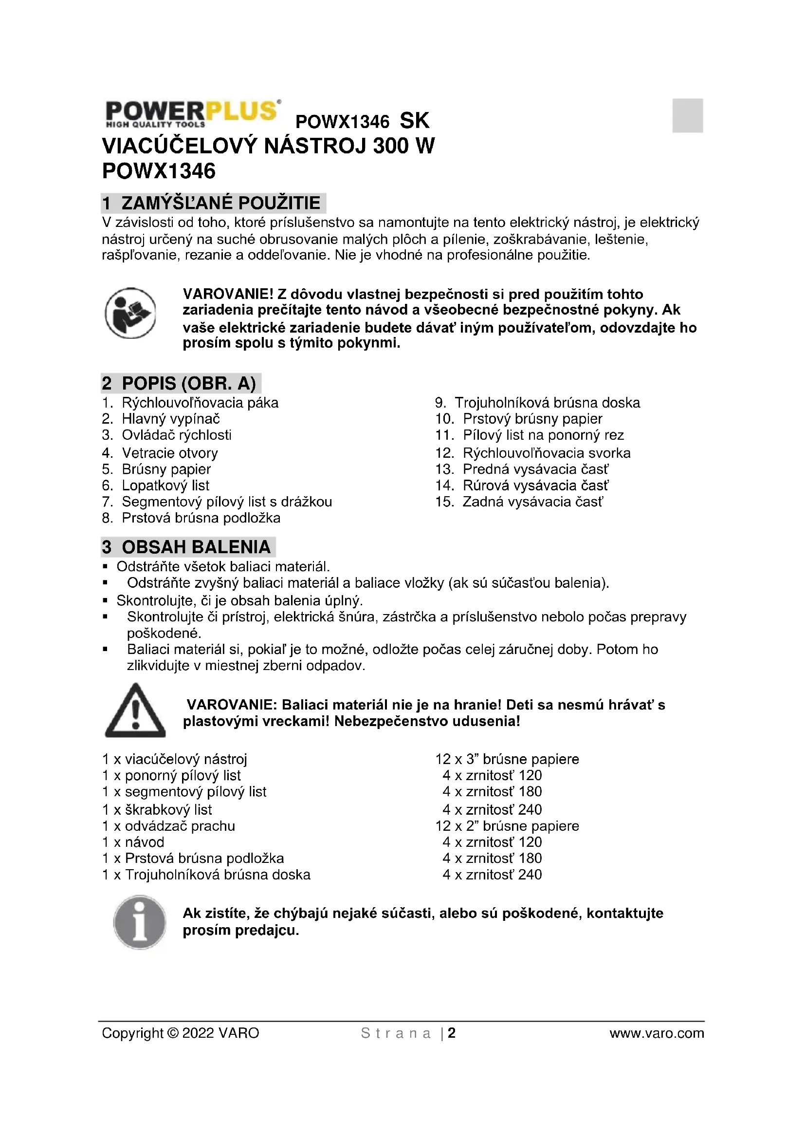 - Baliaci materiál si, pokiaľ je to možné, odložte počas celej záručnej doby. Potom ho zlikvidujte v miestnej zberni odpadov. VAROVANIE: Baliaci materiál nie je na hranie! Deti sa nesmú hrávať s plastovými vreckami! Nebezpečenstvo udusenia! 1 x viacúčelový nástroj 1 x ponorný pílový list 1 x segmentový pílový list 1 x škrabkový list 1 x odvádzač prachu 1 x návod 1 x Prstová brúsna podložka 1 x Trojuholníková brúsna doska 12 x 3” brúsne papiere 4 x zrnitosť 120 4 x zrnitosť 180 4 x zrnitosť 240 12 x 2” brúsne papiere 4 x zrnitosť 120 4 x zrnitosť 180 4 x zrnitosť 240 Ak zistíte, že chýbajú nejaké súčasti, alebo sú poškodené, kontaktujte prosím predajcu.POWX1346 SK Copyright © 2022 VARO S t r a n a | 3 www.varo.com 4 SYMBOLY V tomto návode a/alebo na stroji sa používajú nasledujúce symboly: