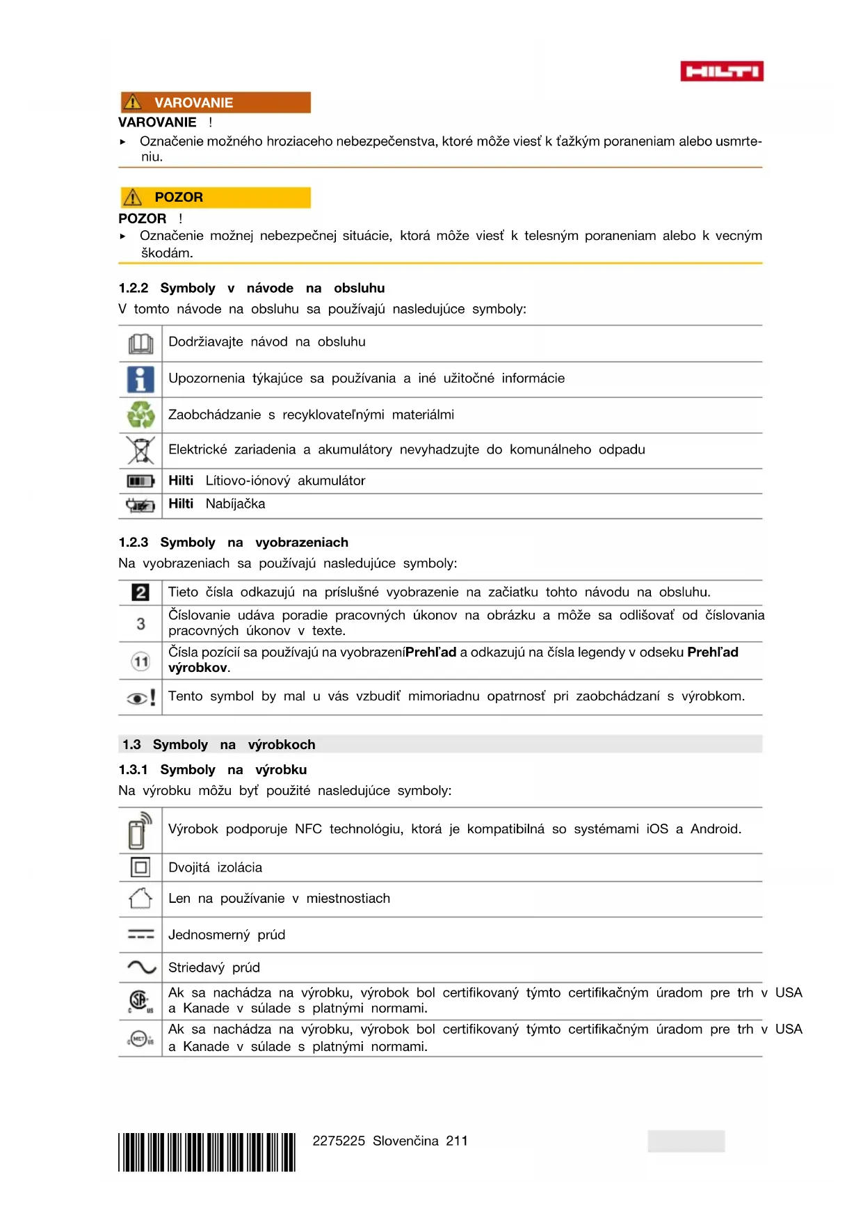 - Po prácach spojených so starostlivosťou a udržiavaním náradia pripevnite všetky ochranné zariadenia a skontrolujte ich fungovanie. Aby bola zaistená bezpečná prevádzka, používajte len originálne náhradné súčiastky a spotrebné materiály. Nami schválené náhradné súčiastky, spotrebné materiály a príslušenstvo pre váš výrobok nájdete vo vašom Hilti Store alebo na stránke: www.hilti.group.216 Slovenčina 2275225 *2275225*