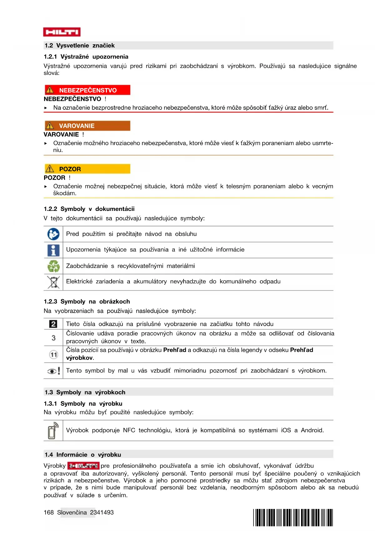 - Po prácach spojených so starostlivosťou a údržbou výrobku pripevnite všetky ochranné zariadenia a skontrolujte ich bezchybné fungovanie. Na bezpečnú prevádzku používajte len originálne náhradné diely a spotrebné materiály. Firmou Hilti schválené náhradné súčiastky, spotrebné materiály a príslušenstvo pre váš výrobok nájdete vo vašom Hilti Store alebo na stránke: www.hilti.group*2341493* 2341493 Slovenčina 175