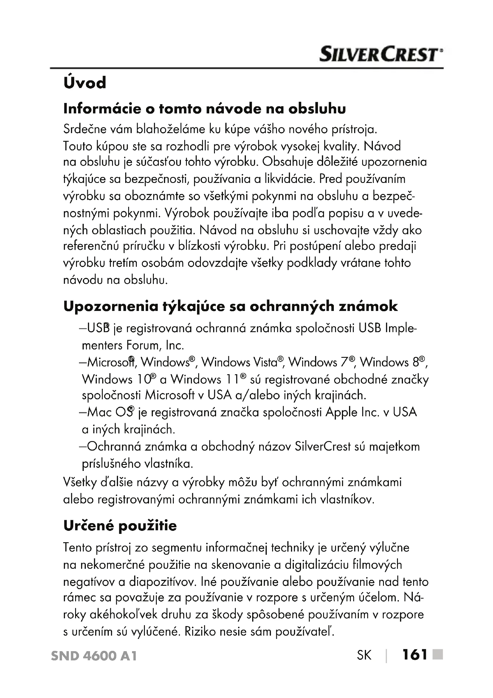 je registrovaná značka spoločnosti Apple Inc. v USA a iných krajinách. – Ochranná známka a obchodný názov SilverCrest sú majetkom príslušného vlastníka. Všetky ďalšie názvy a výrobky môžu byť ochrannými známkami alebo registrovanými ochrannými známkami ich vlastníkov. Určené použitie Tento prístroj zo segmentu informačnej techniky je určený výlučne na nekomerčné použitie na skenovanie a digitalizáciu filmových negatívov a diapozitívov. Iné používanie alebo používanie nad tento rámec sapovažuje zapoužívanie v rozpore s určenýmúčelom. Ná- roky akéhokoľvek druhu za škody spôsobené používaním v rozpore s určením sú vylúčené. Riziko nesie sám používateľ.SND 4600 A1 ■ 162 │ SK Použité výstražné upozornenia a symboly Vpredloženom návode na obsluhu sú použité nasledovné výstražné upozornenia: NEBEZPEČENSTVO Výstražné upozornenie stýmto stupňom nebezpe- čenstva označuje nebezpečnú situáciu. Ak sa nezabráni nebezpečnej situácii, bude to mať za násle- dok ťažké zranenia alebo smrť. ► Aby sa zabránilo nebezpečenstvu ťažkých zranení alebo smrti, musia sa dodržiavať inštrukcie uvedené v tomto výstražnom upozornení. VÝSTRAHA Výstražné upozornenie tohto stupňa nebezpe- čenstva označuje možnú nebezpečnú situáciu. Ak sa nezabráni nebezpečnej situácii, môže to mať za násle- dok ťažké zranenia alebo smrť. ► Aby sa zabránilo nebezpečenstvu ťažkých zranení alebo smrti, musia sa dodržiavať inštrukcie uvedené v tomto výstražnom upozornení. OPATRNE Výstražné upozornenie tohto stupňa nebezpe- čenstva označuje možnú nebezpečnú situáciu. Ak sa tejto nebezpečnej situácii nezabráni, môže to mať za následok zranenia. ► Aby ste zabránili zraneniam osôb, riaďte sa inštrukciami uvedenými vtomto výstražnom upozornení.SND 4600 A1 SK │ 163 ■ POZOR Výstražné upozornenie tohto stupňa nebezpečenstva označuje možné vecné škody. Ak sa tejto nebezpečnej situácii nezabráni, môže to mať za následokvecné škody. ► Aby ste zabránili vecným škodám, riaďte sa inštrukciami uvede- nými vtomto výstražnom upozornení. UPOZORNENIE ► Upozornenie obsahuje dodatočné informácie, ktoré uľahčujú manipuláciu sprístrojom. Bezpečnostné pokyny ■ Predpoužívaním skontrolujte prípadné viditeľné poškodenia prí- stroja. Doprevádzky neuvádzajte poškodený prístroj ani prístroj, ktorý predtým spadol nazem. ■ Poškodené káble alebo prívody nechajte vymeniť autorizovaným odborníkom alebo vzákazníckom servise. ■ Tento prístroj môžu používať deti od 8 rokov a tiež osoby so zní- ženými fyzickými, senzorickými alebo mentálnymi schopnosťami, prípadne snedostatočnými skúsenosťami alebo znalosťami, ak sú pod dohľadom, alebo ak boli dostatočne poučené obezpečnom používaní prístroja apochopili ztoho vyplývajúce riziká. Deti sa nesmú hrať s prístrojom. Deti nesmú vykonávať čistenie anipouží- vateľskú údržbu bez dohľadu. ■ Opravy prístroja smie vykonávať iba autorizovaný špecializovaný obchod alebo zákaznícky servis. Dôsledkom neodborných opráv môžu pre používateľa vzniknúť značné nebezpečenstvá. Navyše zanikne nárok na záruku. ■ Na prístroji nevykonávajte žiadne prestavby ani zmeny.SND 4600 A1 ■ 164 │ SK ■ Prístroj chráňte pred vlhkosťou avniknutím kvapalín dovnútra. Nestavajte na prístroj alebo vedľa prístroja žiadne predmety naplnené tekutinou (napr. vázy). ■ Nevystavujte prístroj pôsobeniu otvoreného plameňa a nestavajte naň alebo vedľa neho žiadne sviečky. Zabránite tak šíreniu požiaru. ■ Po rýchlom prenesení prístroja z tepla do chladu alebo z chladu do tepla ho nechajte aklimatizovať 30min.