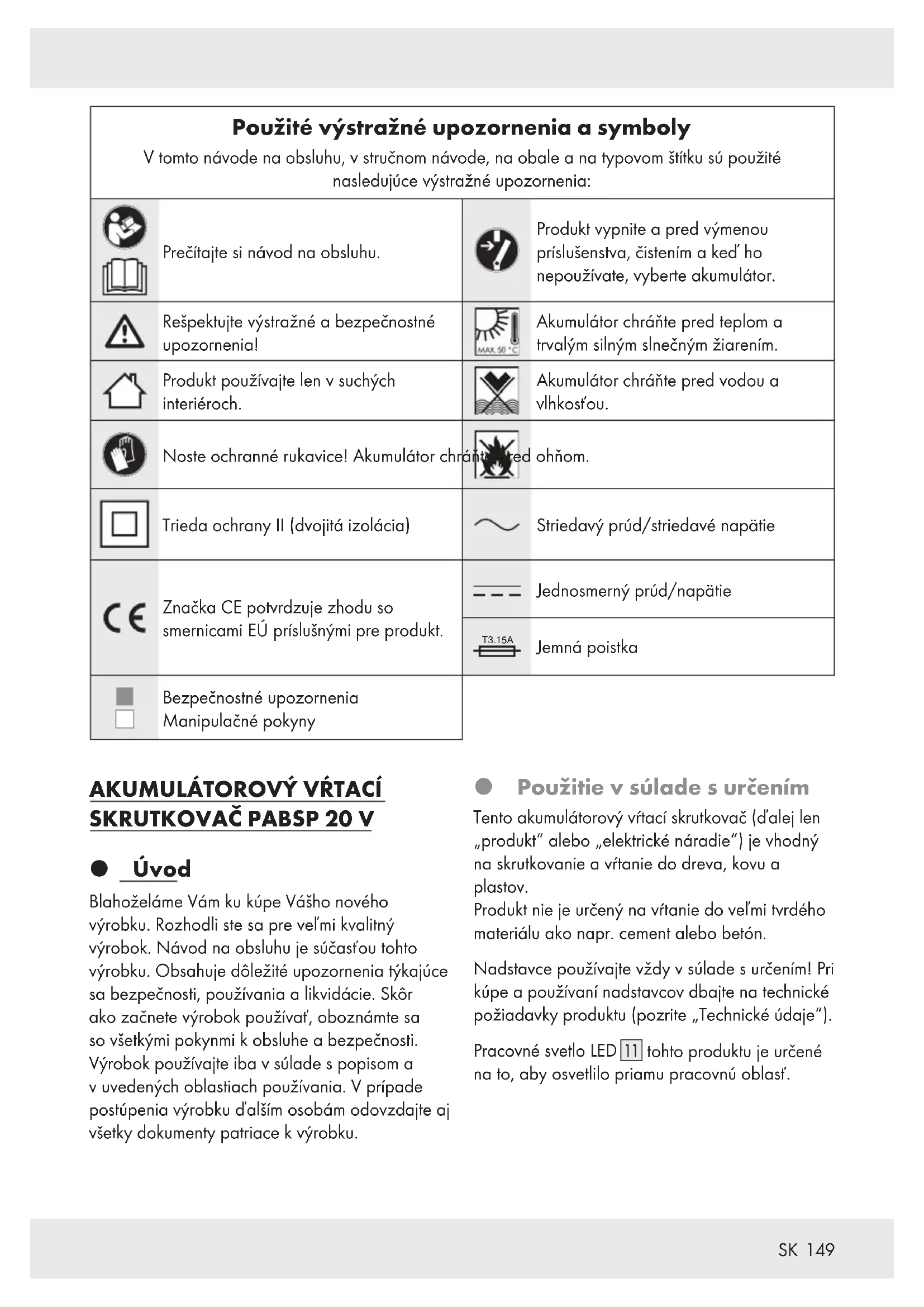 Úvod Blahoželáme Vám ku kúpe Vášho nového výrobku. Rozhodli ste sa pre veľmi kvalitný výrobok. Návod na obsluhu je súčasťou tohto výrobku. Obsahuje dôležité upozornenia týkajúce sa bezpečnosti, používania a likvidácie. Skôr ako začnete výrobok používať, oboznámte sa so všetkými pokynmi k obsluhe a bezpečnosti. Výrobok používajte iba v súlade s popisom a v uvedených oblastiach používania. V prípade postúpenia výrobku ďalším osobám odovzdajte aj všetky dokumenty patriace k výrobku. Použitie v súlade s určením Tento akumulátorový vŕtací skrutkovač (ďalej len „produkt“ alebo „elektrické náradie“) je vhodný na skrutkovanie a vŕtanie do dreva, kovu a plastov. Produkt nie je určený na vŕtanie do veľmi tvrdého materiálu ako napr. cement alebo betón. Nadstavce používajte vždy v súlade s určením! Pri kúpe a používaní nadstavcov dbajte na technické požiadavky produktu (pozrite „Technické údaje“). Pracovné svetlo LED [] tohto produktu je určené na to, aby osvetlilo priamu pracovnú oblasť.150