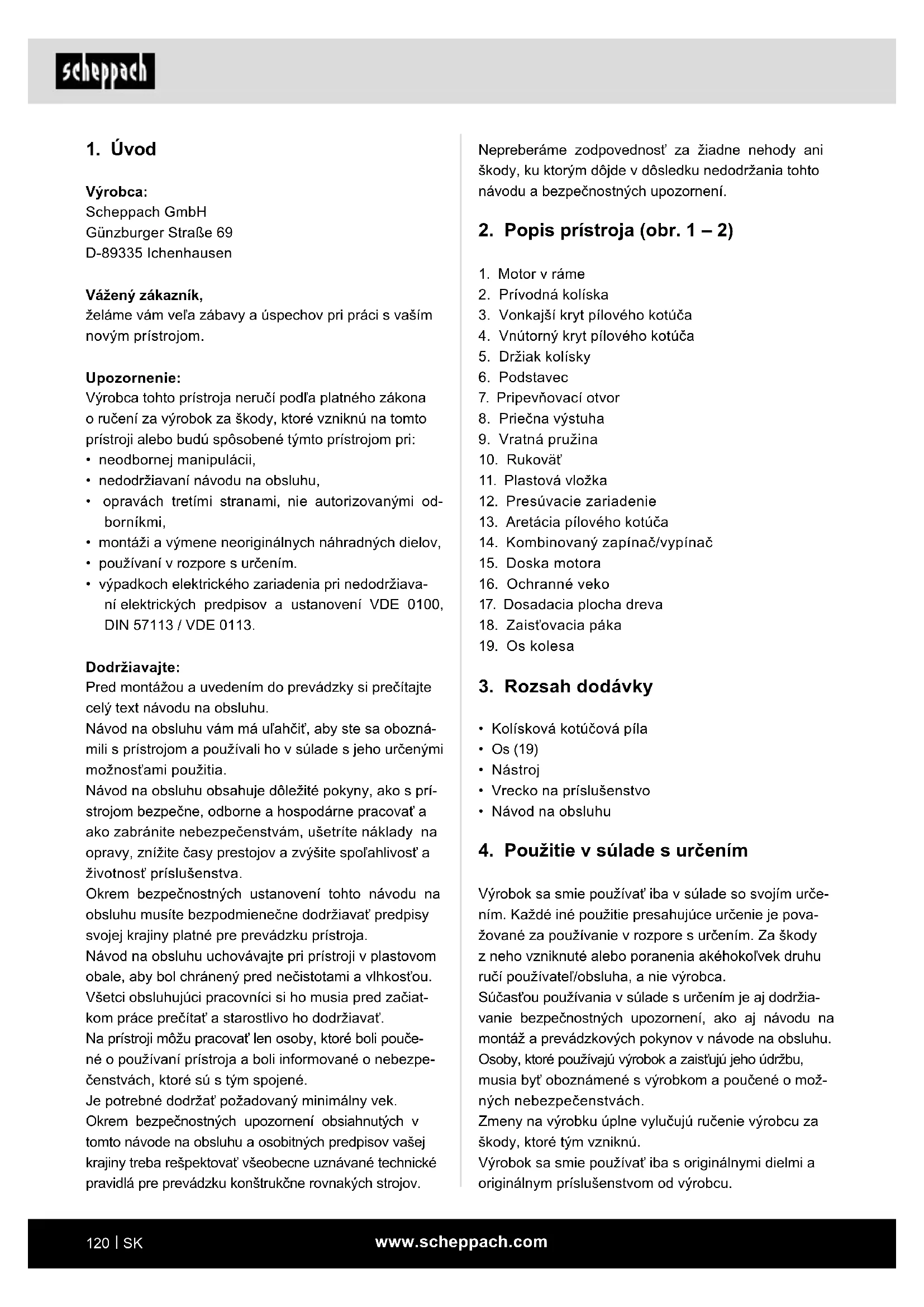 Výrobca: Scheppach GmbH Günzburger Straße 69 D-89335 Ichenhausen Vážený zákazník, želáme vám veľa zábavy a úspechov pri práci s vaším novým prístrojom. Upozornenie: Výrobca tohto prístroja neručí podľa platného zákona o ručení za výrobok za škody, ktoré vzniknú na tomto prístroji alebo budú spôsobené týmto prístrojom pri: