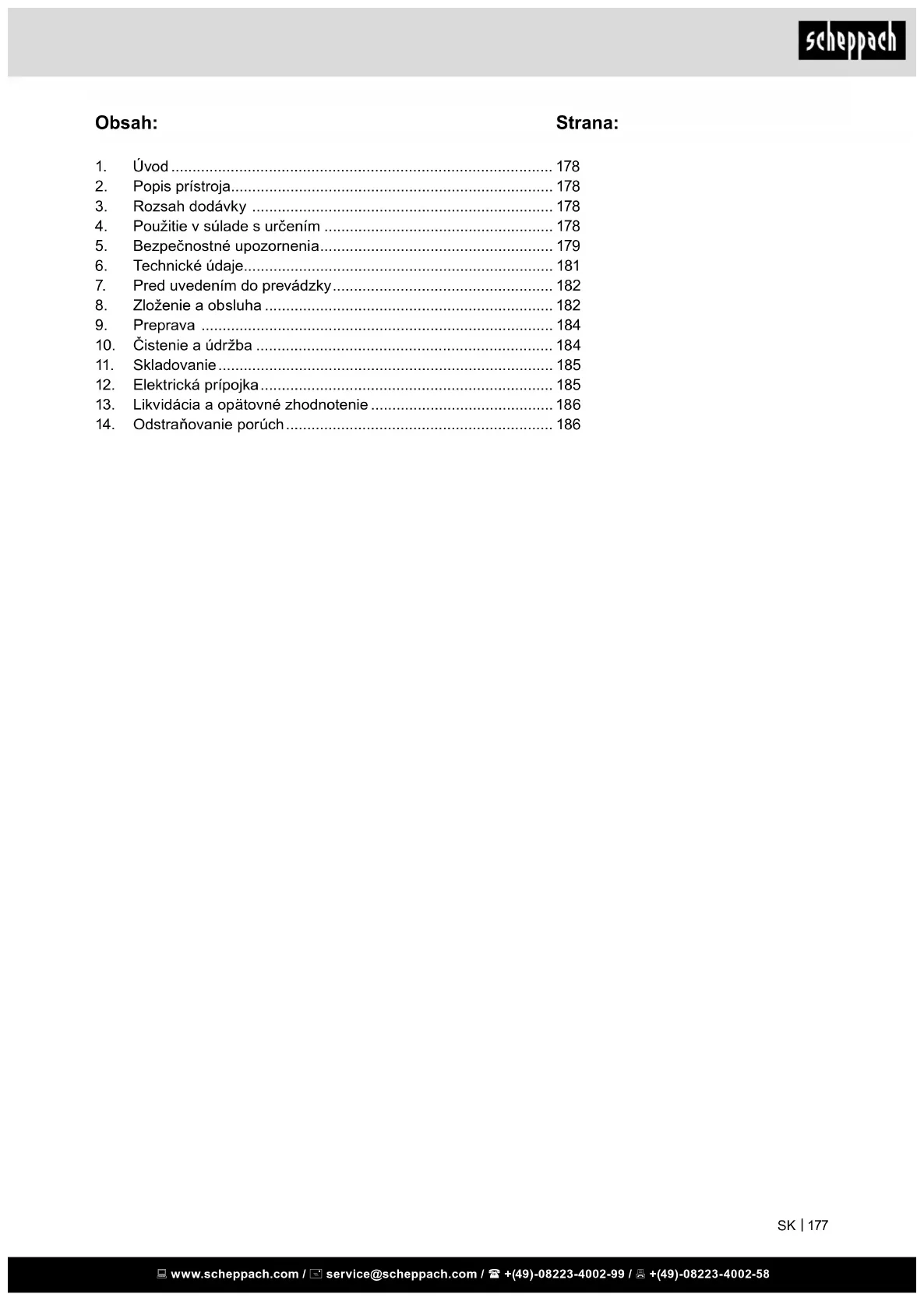 Prístroj a jeho príslušenstvo skladujte na tmavom, suchom a nezamŕzajúcom mieste neprístupnom pre deti. Optimálna skladovacia teplota sa nachádza me- dzi 5 a 30 ˚C. Elektrický prístroj skladujte v originálnom obale. Elektrický prístroj zakryte, aby ste ho chránili pred prachom alebo vlhkosťou. Návod na obsluhu skladujte pri elektrickom prístroji. www.scheppach.com / service@scheppach.com / +(49)-08223-4002-99 / +(49)-08223-4002-58