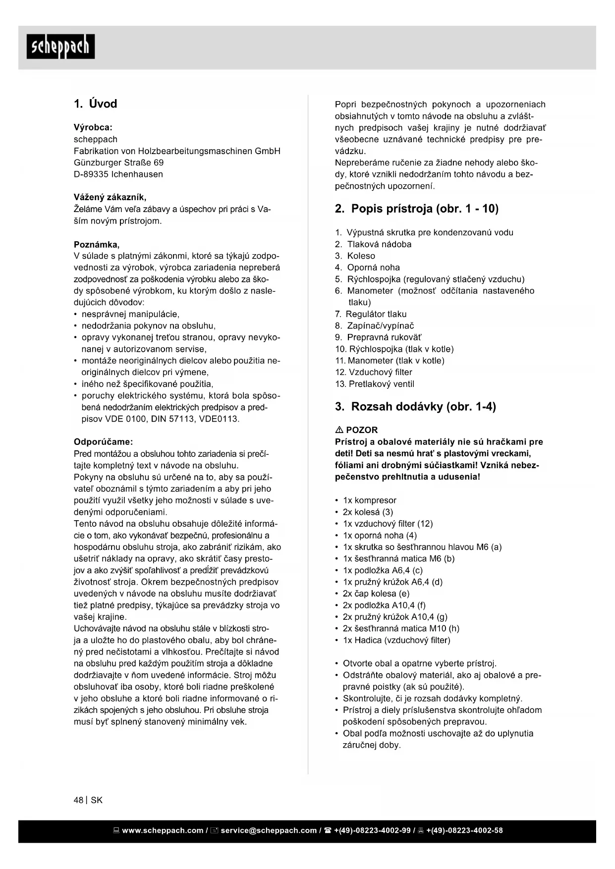 - Skontrolujte tlakovú nádobu pred každým použi- tím, či nie je skorodovaná alebo poškodená. Kom- presor sa nesmie prevádzkovať s poškodenou ale- bo skorodovanou tlakovou nádobou. V prípade, že sa zistia poškodenia, obráťte sa prosím na zákaz- nícky servis. Starostlivo uschovajte tieto bezpečnostné po- kyny. www.scheppach.com / service@scheppach.com / +(49)-08223-4002-99 / +(49)-08223-4002-58