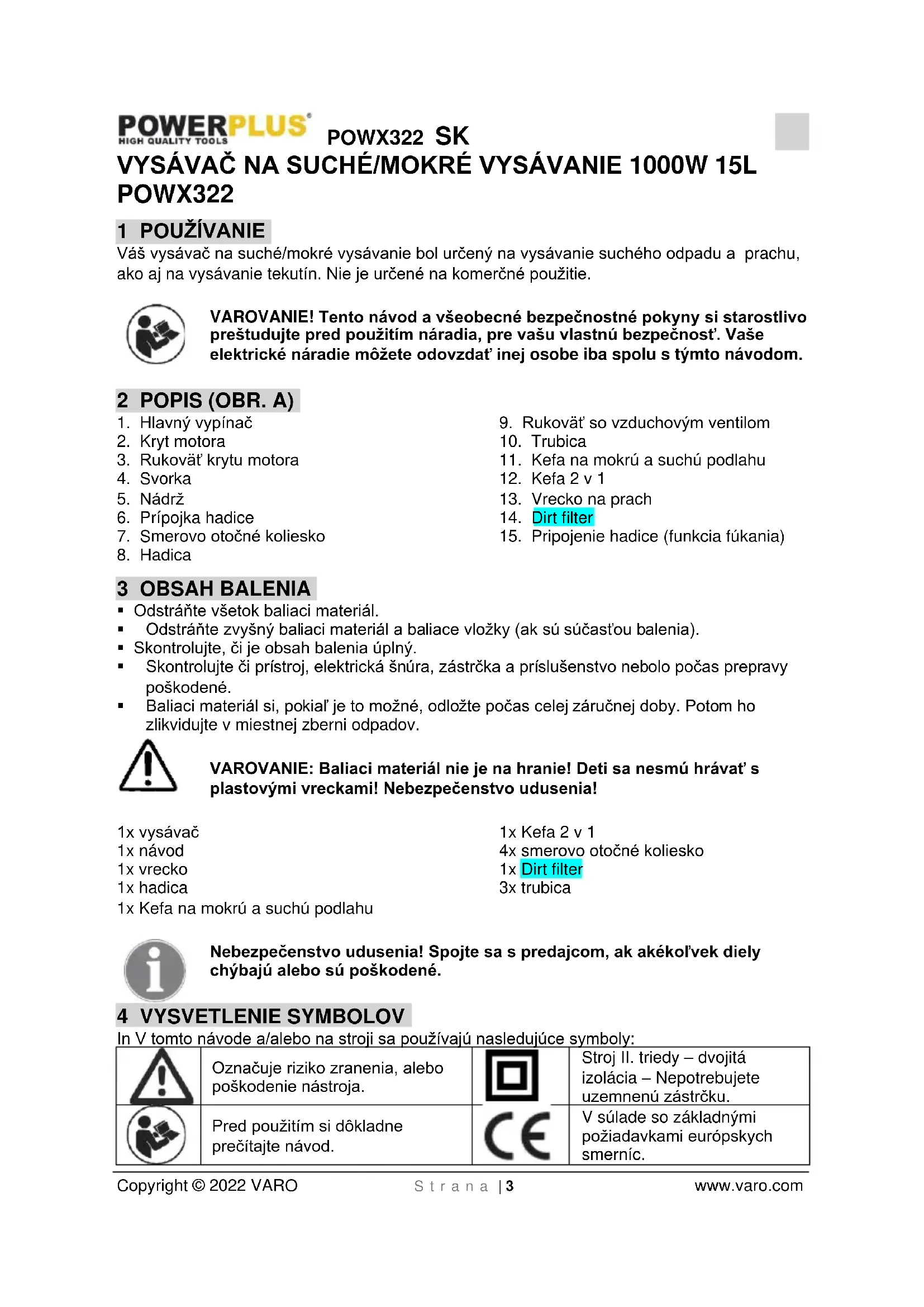 Veľkosť nádrže 280x250mm Funkcia fúkania Áno Typ trubice 3 časti Dĺžka hadice 1,5m Typ vysávania Na sucho a na mokroPOWX322 SK Copyright © 2022 VARO S t r a n a | 8 www.varo.com