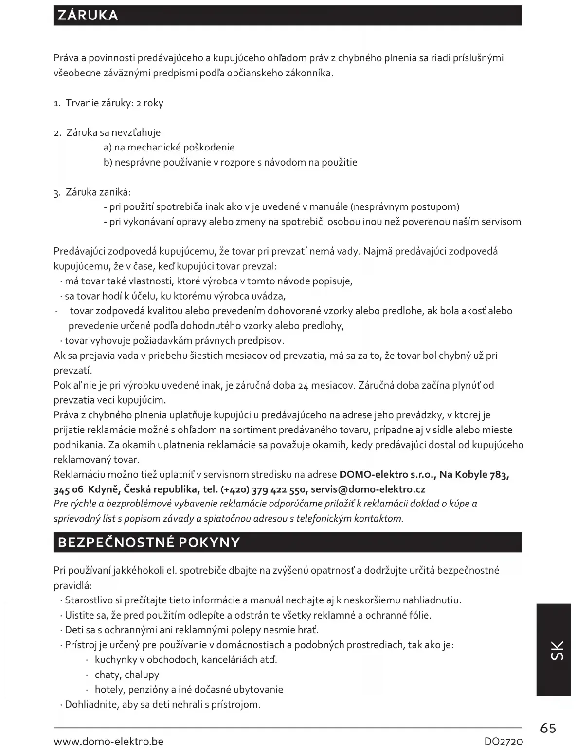 - tovar vyhovuje požiadavkám právnych predpisov. Ak sa prejavia vada v priebehu šiestich mesiacov od prevzatia, má sa za to, že tovar bol chybný už pri prevzatí. Pokiaľ nie je pri výrobku uvedené inak, je záručná doba 24 mesiacov. Záručná doba začína plynúť od prevzatia veci kupujúcim. Práva z chybného plnenia uplatňuje kupujúci u predávajúceho na adrese jeho prevádzky, v ktorej je prijatie reklamácie možné s ohľadom na sortiment predávaného tovaru, prípadne aj v sídle alebo mieste podnikania. Za okamih uplatnenia reklamácie sa považuje okamih, kedy predávajúci dostal od kupujúceho reklamovaný tovar. Reklamáciu možno tiež uplatniť v servisnom stredisku na adrese DOMO-elektro s.r.o., Na Kobyle 783, 345 06 Kdyně, Česká republika, tel. (+420) 379 422 550, servis@domo-elektro.cz Pre rýchle a bezproblémové vybavenie reklamácie odporúčame priložiť k reklamácii doklad o kúpe a sprievodný list s popisom závady a spiatočnou adresou s telefonickým kontaktom.