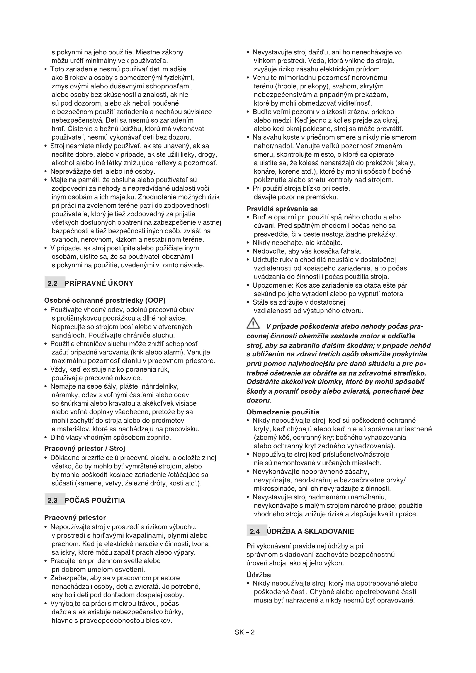 - Nikdy nepoužívajte stroj, ktorý ma opotrebované alebo poškodené časti. Chybné alebo opotrebované časti musia byť nahradené a nikdy nesmú byť opravované.SK – 3