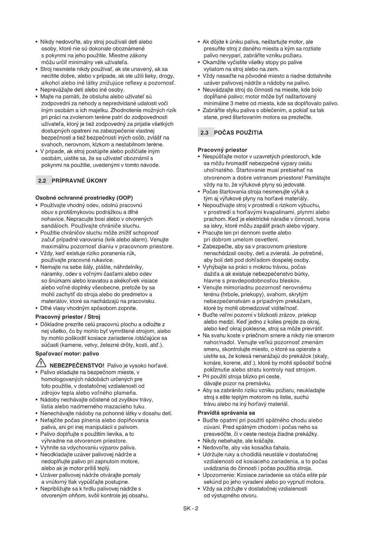 - Počas štartovania stroja nesmerujte výfuk a tým aj výfukové plyny na horľavé materiály.