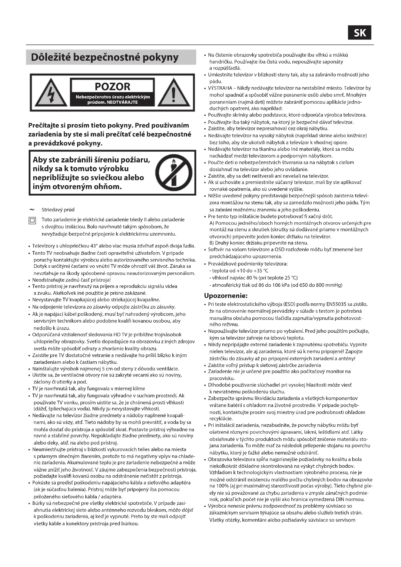 - Tento TV neobsahuje žiadne časti opraviteľné užívateľom. Vprípade poruchy kontaktujte výrobcu alebo autorizovaného servisného technika. Dotyk surčitými časťami vo vnútri TV môže ohroziť váš život. Záruka sa nevzťahuje na škody spôsobené opravou neautorizovaným personálom.