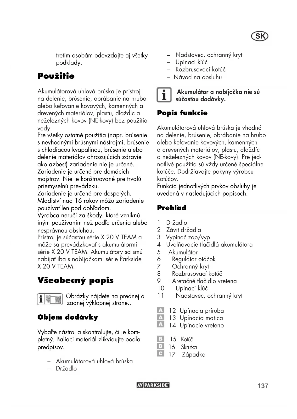 tretím osobám odovzdajte aj všetky podklady. Použitie Akumulátorováuhlovábrúskajeprístroj nadelenie,brúsenie,obrábanienahrubo alebokefovaniekovových,kamennýcha drevenýchmateriálov,plastu,dlaždíca neželeznýchkovov(NE-kovy)bezpoužitia vody. Prevšetkyostatnépoužitia(napr.brúsenie snevhodnýmibrúsnyminástrojmi,brúsenie schladiacoukvapalinou,brúseniealebo deleniemateriálovohrozujúcichzdravie akoazbest)zariadenieniejeurčené. Zariadeniejeurčenépredomácich majstrov.Niejekonštruovanépretrvalú priemyselnúprevádzku. Zariadeniejeurčenépredospelých. Mladistvínad16rokovmôžuzariadenie používaťlenpoddohľadom. Výrobcaneručízaškody,ktorévzniknú inýmpoužívanímnežpodľaurčeniaalebo nesprávnou obsluhou. PrístrojjesúčasťousérieX20VTEAMa môžesaprevádzkovaťsakumulátormi sérieX20VTEAM.Akumulátorysasmú nabíjaťibasnabíjačkamisérieParkside X20VTEAM. Všeobecný popis Obrázky nájdete na prednej a zadnejvýklopnejstrane.. Objem dodávky Vybaľtenástrojaskontrolujte,čijekom- pletný.Baliacimateriálzlikvidujtepodľa predpisov. – Akumulátorováuhlovábrúska – Držadlo – Nadstavec,ochrannýkryt – Upínacíkľúč – Rozbrusovacíkotúč – Návod na obsluhu Akumulátoranabíjačkaniesú súčasťoudodávky. Popis funkcie Akumulátorováuhlovábrúskajevhodná nadelenie,brúsenie,obrábanienahrubo alebokefovaniekovových,kamenných adrevenýchmateriálov,plastu,dlaždíc aneželeznýchkovov(NE-kovy).Prejed- notlivépoužitiasúvždyurčenéšpeciálne kotúče.Dodržiavajtepokynyvýrobcu kotúčov. Funkciajednotlivýchprvkovobsluhyje uvedenávnasledujúcichpopisoch. Prehľad 1 Držadlo 2 Závitdržadla 3 Vypínačzap/vyp 4 Uvoľňovacietlačidláakumulátora 5 Akumulátor 6 Regulátorotáčok 7 Ochrannýkryt 8 Rozbrusovacíkotúč 9 Aretačnétlačidlovretena 10 Upínacíkľúč 11 Nadstavec,ochrannýkryt 12 Upínacia príruba 13 Upínacia matica 14 Upínacie vreteno 15 Kotúč 16 Skrutka 17 Západka138
