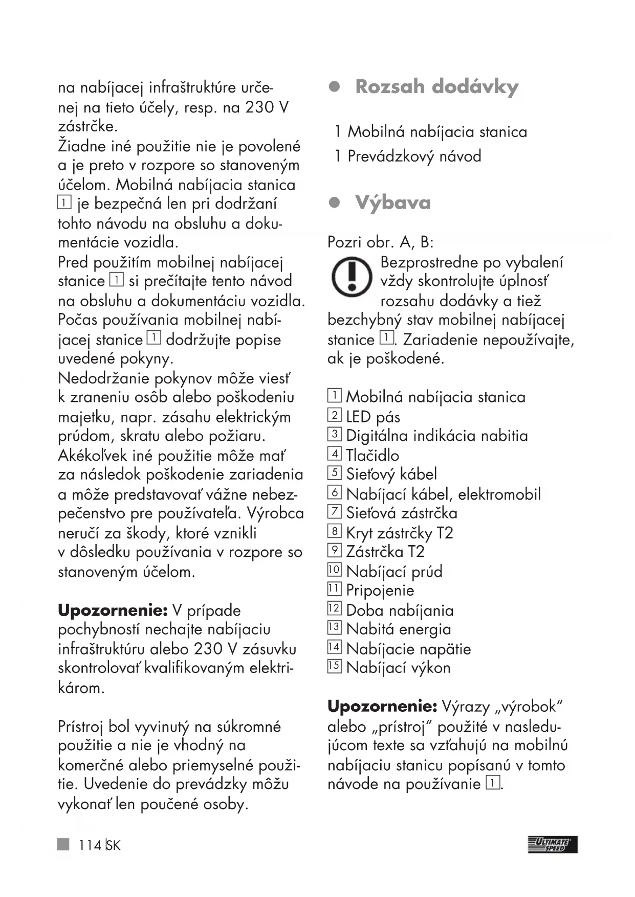 dodržujte popise uvedené pokyny. Nedodržanie pokynov môže viesť kzraneniu osôb alebo poškodeniu majetku, napr. zásahu elektrickým prúdom, skratu alebo požiaru. Akékoľvek iné použitie môže mať za následok poškodenie zariadenia amôže predstavovať vážne nebez- pečenstvo pre používateľa. Výrobca neručí za škody, ktoré vznikli vdôsledku používania vrozpore so stanoveným účelom. Upozornenie: Vprípade pochybností nechajte nabíjaciu infraštruktúru alebo 230V zásuvku skontrolovať kvalifikovaným elektri- károm. Prístroj bol vyvinutý na súkromné použitie a nie je vhodný na komerčné alebo priemyselné použi- tie. Uvedenie do prevádzky môžu vykonať len poučené osoby. z Rozsah dodávky 1 Mobilná nabíjacia stanica 1 Prevádzkový návod z Výbava Pozri obr. A, B: Bezprostredne po vybalení vždy skontrolujte úplnosť rozsahu dodávky a tiež bezchybný stav mobilnej nabíjacej stanice