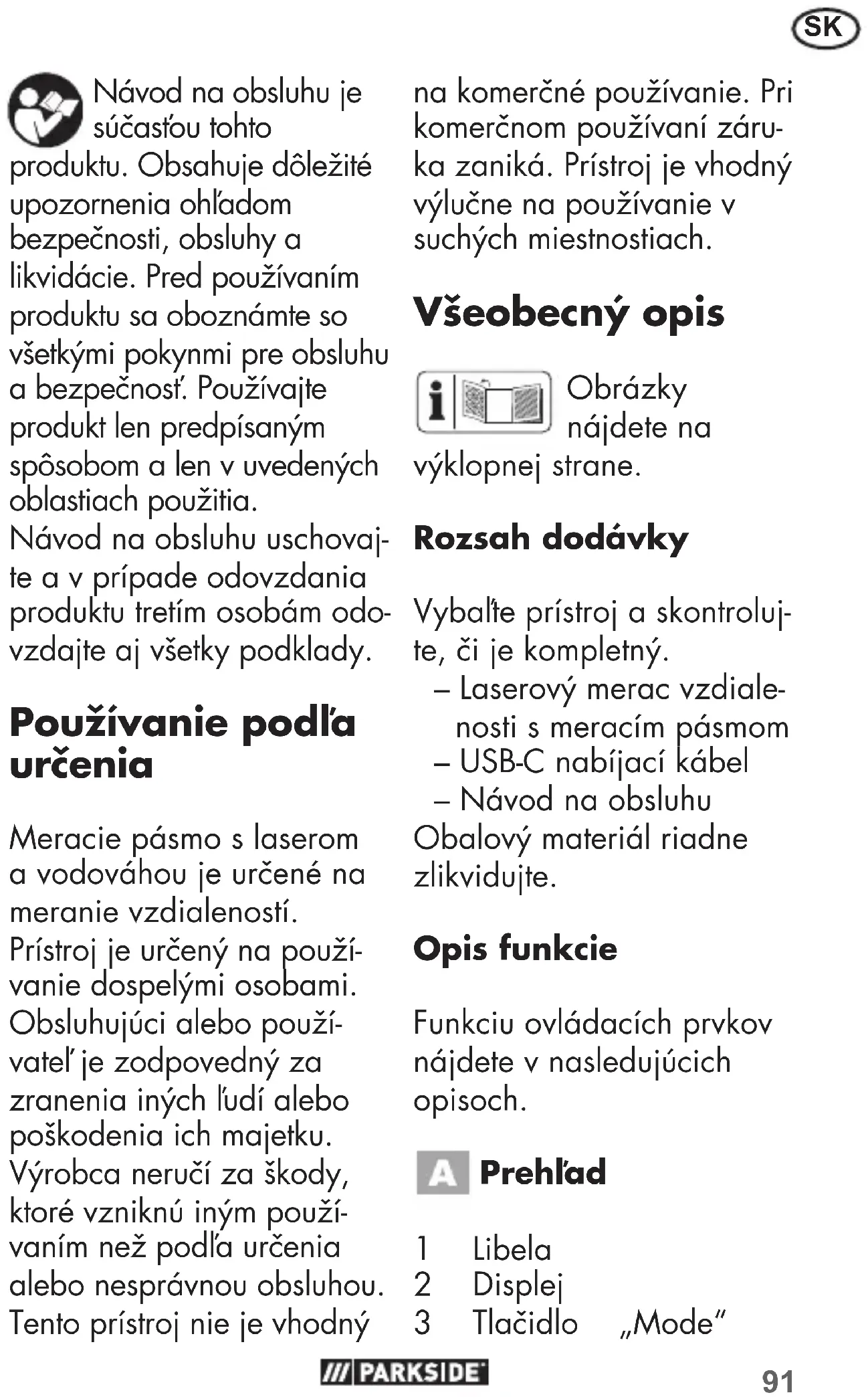 Návod na obsluhu je súčasťou tohto produktu. Obsahuje dôležité upozornenia ohľadom bezpečnosti, obsluhy a likvidácie. Pred používaním produktu sa oboznámte so všetkými pokynmi pre obsluhu a bezpečnosť. Používajte produkt len predpísaným spôsobom a len v uvedených oblastiach použitia. Návod na obsluhu uschovaj- te a v prípade odovzdania produktu tretím osobám odo- vzdajte aj všetky podklady. Používanie podľa určenia Meracie pásmo s laserom a vodováhou je určené na meranie vzdialeností. Prístroj je určený na použí- vanie dospelými osobami. Obsluhujúci alebo použí- vateľ je zodpovedný za zranenia iných ľudí alebo poškodenia ich majetku. Výrobca neručí za škody, ktoré vzniknú iným použí- vaním než podľa určenia alebo nesprávnou obsluhou. Tento prístroj nie je vhodný na komerčné používanie. Pri komerčnom používaní záru- ka zaniká. Prístroj je vhodný výlučne na používanie v suchých miestnostiach. Všeobecný opis Obrázky nájdete na výklopnej strane. Rozsah dodávky Vybaľte prístroj a skontroluj- te, či je kompletný. – Laserový merac vzdiale- nosti s meracím pásmom – USB-C nabíjací kábel – Návod na obsluhu Obalový materiál riadne zlikvidujte. Opis funkcie Funkciu ovládacích prvkov nájdete v nasledujúcich opisoch. Prehľad 1 Libela 2 Displej 3 Tlačidlo „Mode“92